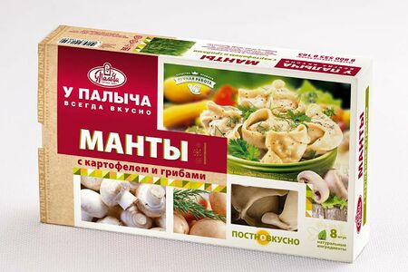 Манты с картофелем и грибами ТМ «У Палыча» изготовлены из мягкого, тонкого, но прочного теста, которое не рвется во время приготовления, с нежной начинкой из картофеля с кусочками ароматных шампиньонов. Для более яркого и выраженного вкуса мы добавили в начинку сочный лук и пряный черный перец.