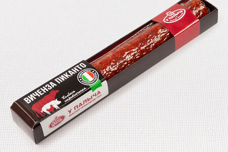 Сырокопченая колбаса Виченза Пиканто изготовлена по старинному итальянскому рецепту, пришедшему из времен Венецианской республики и сохраненный в Музее Палаццо Тьене в Вичензе. В меру жирная свинина, отборная говядина и немного мяса птицы, специи и экстракт чеснока.
