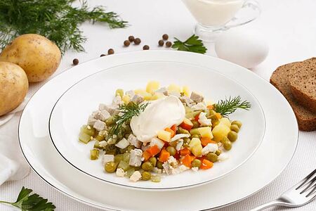 Нарезанные кубиком свинина, картофель, огурцы, вареная морковь, яйцо, консервированный горошек. Салат приправлен специями и майонезом.