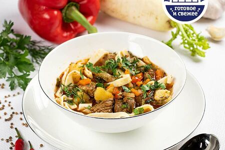 Лагман — блюдо восточной кухни и мы готовим его традиционно, по-восточному: тесто для лапши замешиваем из лучшей муки, раскатываем нужной толщины и нарезаем длинными полосками. Сочное мясо обжариваем с редькой дайкон и ярким ароматным перцем с овощами. Добавляем мясной бульон и тушим вместе с восточными травами и специями. После приготовления, посыпаем свежей зеленью.