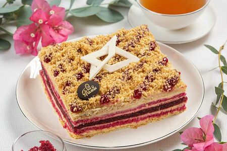 В основе воздушные слоеные коржи, впитавшие в себя нежность фирменного крема на основе сливочного масла. В начинке щедрая прослойка из натуральных ягод малины, с тонким летним ароматом.