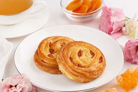 Завитушка из нежного слоеного теста, сочно пропитанного сиропом, с кусочками ароматной кураги.