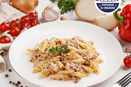 Вариация знаменитого итальянского блюда: отварная паста с кусочками разнообразного мяса в натуральных сливках. Для яркости вкуса — сладкий болгарский перец, сочный обжаренный репчатый лук, изысканный пармезан. Блюдо приправлено пряными специями и чесноком.