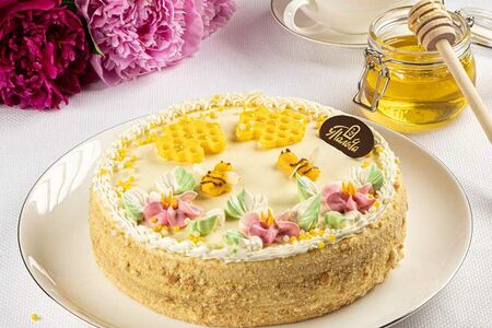 Основу торта составляют тончайшие коржи, которые наши кондитеры раскатывают вручную, из отборной муки высшего сорта с добавлением ароматного меда с фермерской пасеки. Каждый корж пропитан нежным сливочно-заварным кремом из сливочного масла 82,5% по ГОСТ и цельного сгущенного молока.