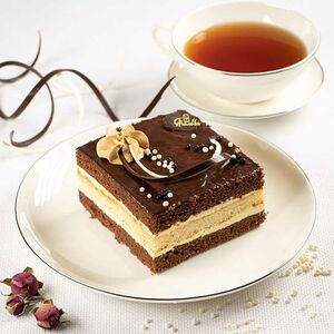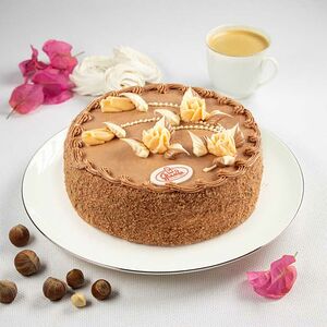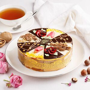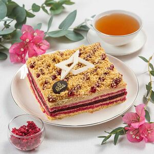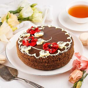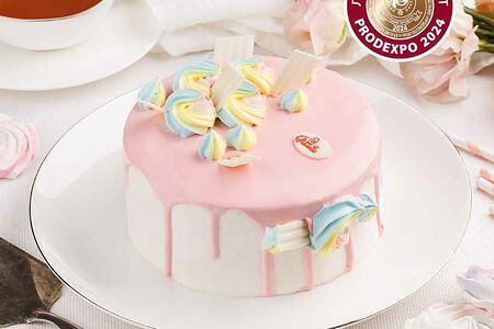 Сбалансированное сочетание ингредиентов придает легкость, которая ощущается в каждом кусочке. Торт украшен сладкой зеркальной глазурью, приятного розового цвета, и декорирован разноцветным кремом и фигурными элементами белой глазури.