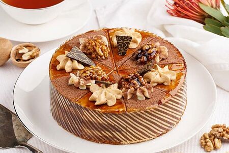 В основе торта медовые коржи из отборной пшеничной муки, пропитанные сливочным кремом на вареном сгущенном молоке. В начинке большое количество грецкого ореха. Сверху торт полит зеркальной карамельной глазурью, декорирован кремом, половинками грецкого ореха и шоколадом.
