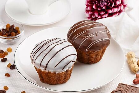 Кексы из сдобного дрожжевого теста с добавлением жареного арахиса или изюма, покрыты белой помадкой и шоколадной глазурью.