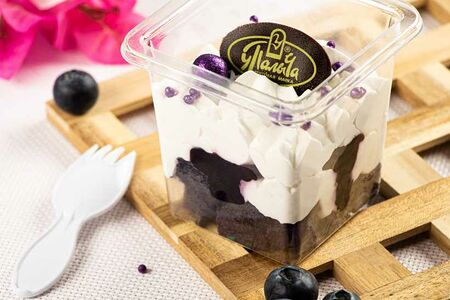 Нежный десерт с муссом из сливок, творожного сыра и ягодами черники. В меру сладкий, в стаканчике с вилочкой внутри — идеальный формат, чтоб взять с собой и насладиться невероятным вкусом.