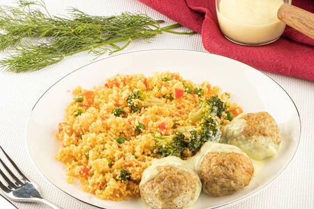 Нежные боллы из индейки запекаем для большей пользы. В гарнир из кус-куса добавляем брокколи, зеленый горошек и болгарский перец. Добавляем к блюду сливочный соус и получаем сбалансированное, полезное, а главное натуральное блюдо.