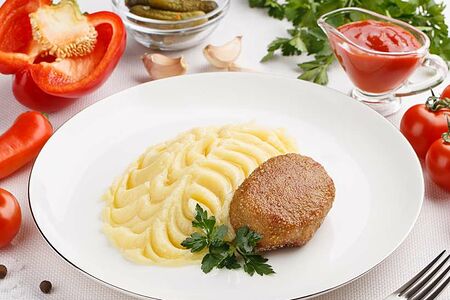 Зразы из нежного мяса птицы в хрустящей панировке, с фирменной начинкой и картофельным пюре.