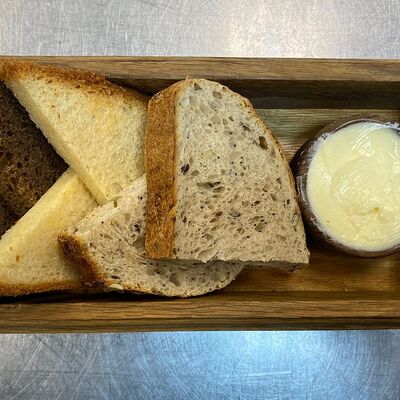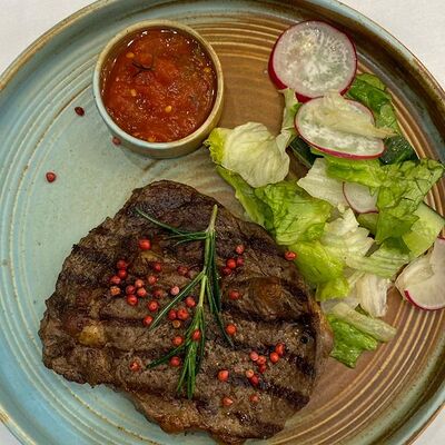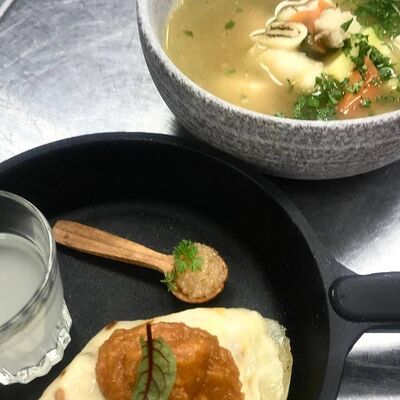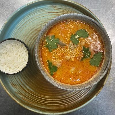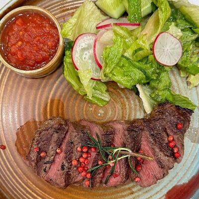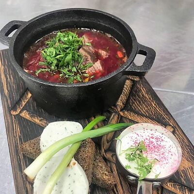 Борщ с говядиной и бутербродом на черном хлебе со смальцем доставка