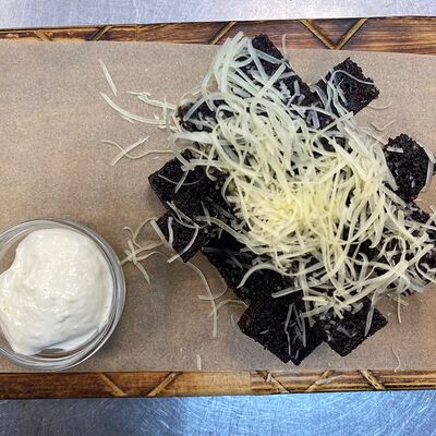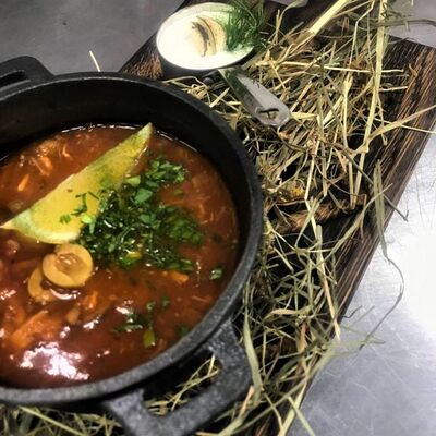 Бульон говяжий, говяжьи щеки, лук, морковь, капуста, картофель, капуста, чернослив, зелень, хлеб бородинский, смалец из сала, сметана