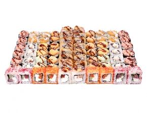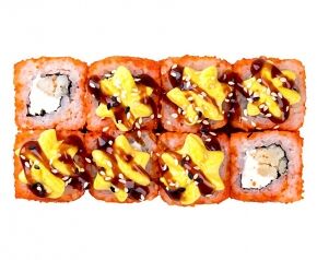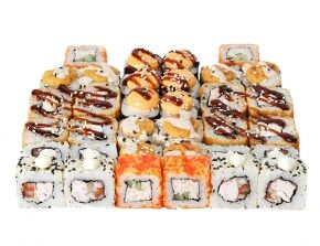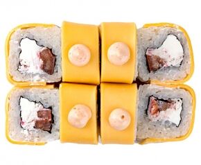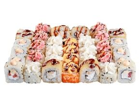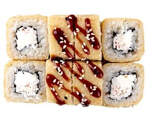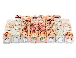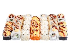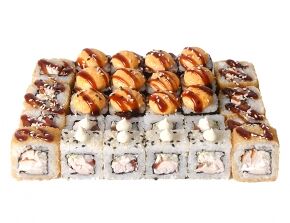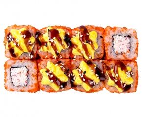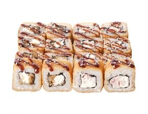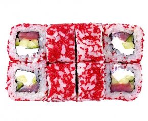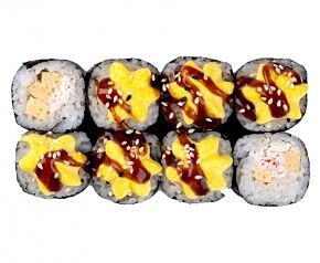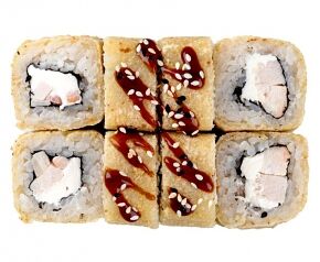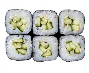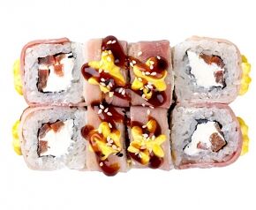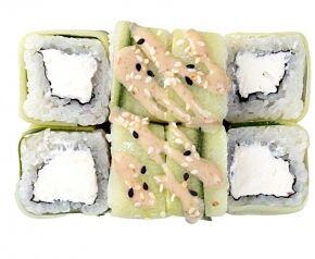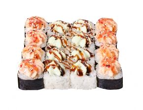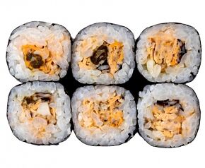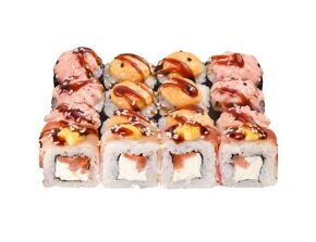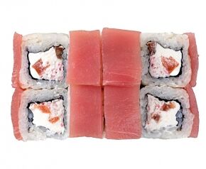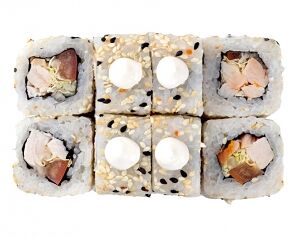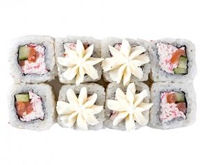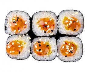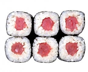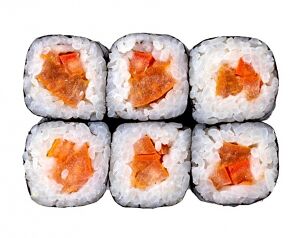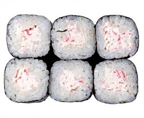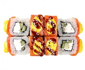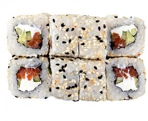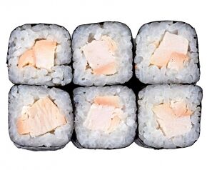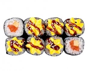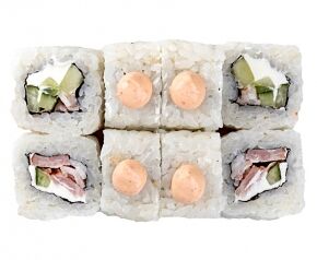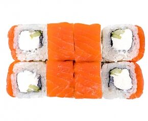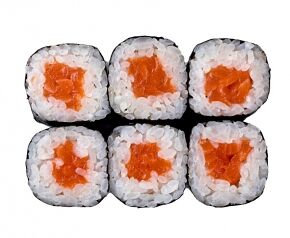 Слабосоленый лосось, рис, нори. Соевый соус, имбирь, васаби добавляются отдельно. Пищевая ценность на 100 г: белки - 8,5 г, жиры - 1,8 г, углеводы - 26,0 г. 154,0 ккал/100 г