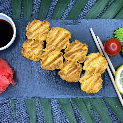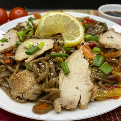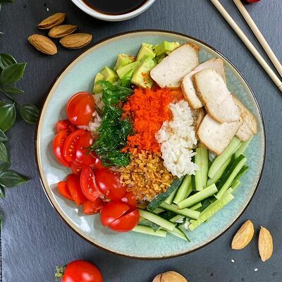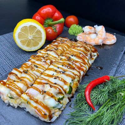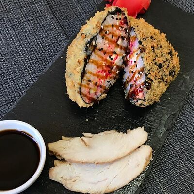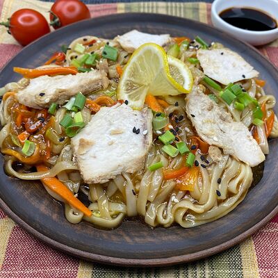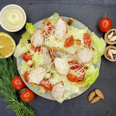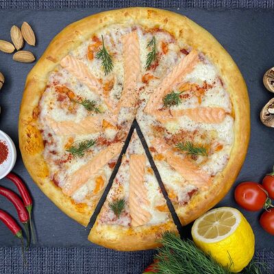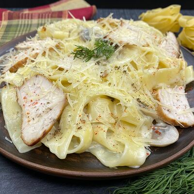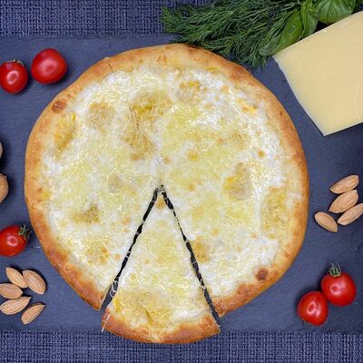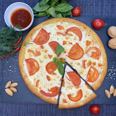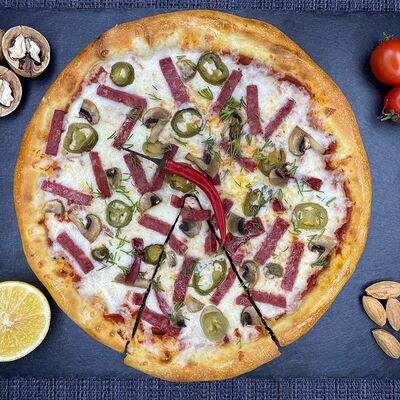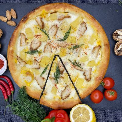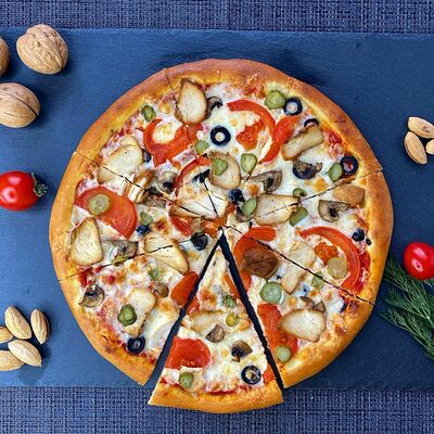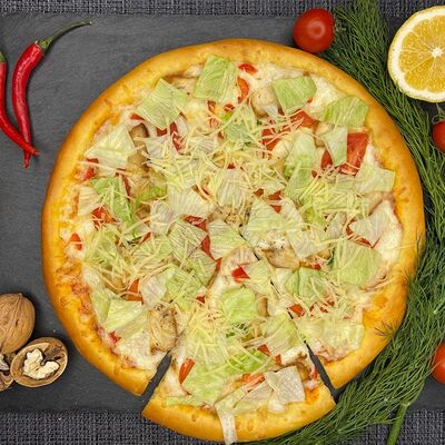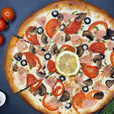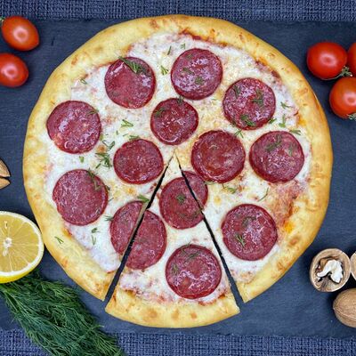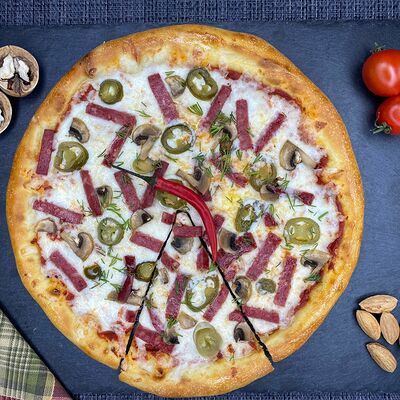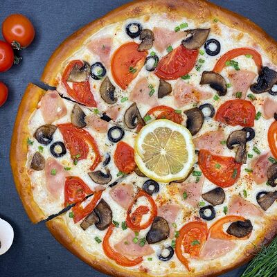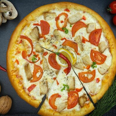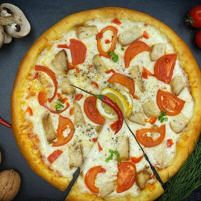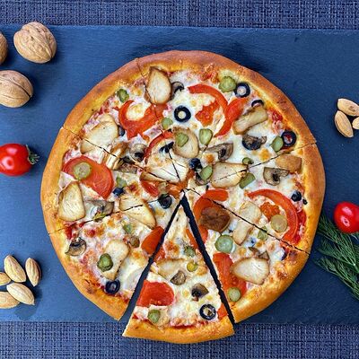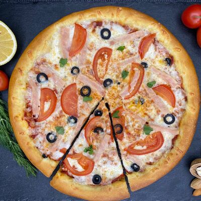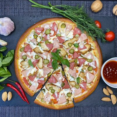 Соус для пиццы, сыр моцарелла, ветчина куринная, шампиньоны, тесто