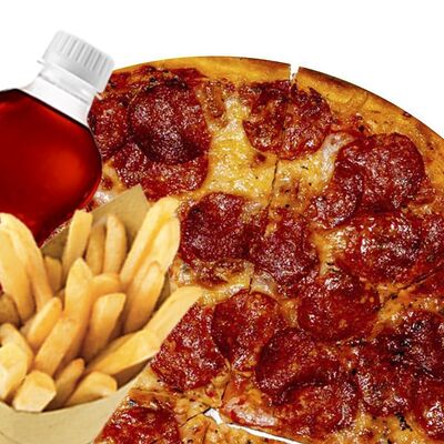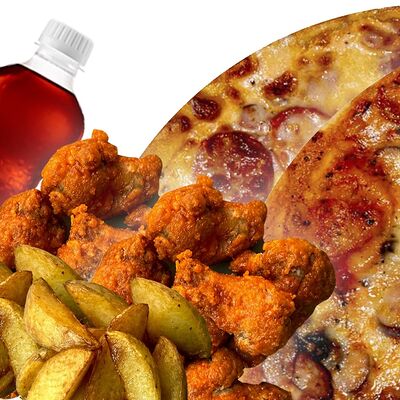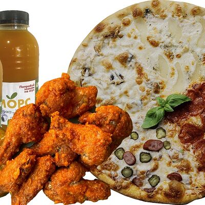 Пицца Карне (32 см), Пицца Деревенская мясная (32 см), крылышки медовые, крылышки острые, картофель по-деревенски (2 порции), Добрый кола (2 шт; 500 мл)