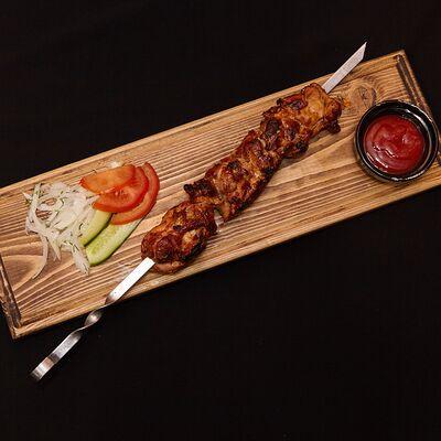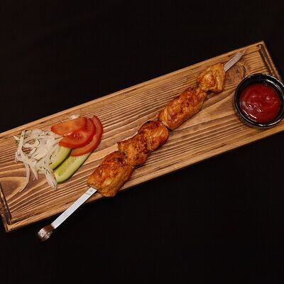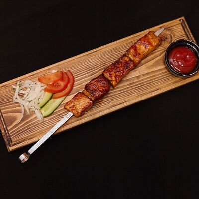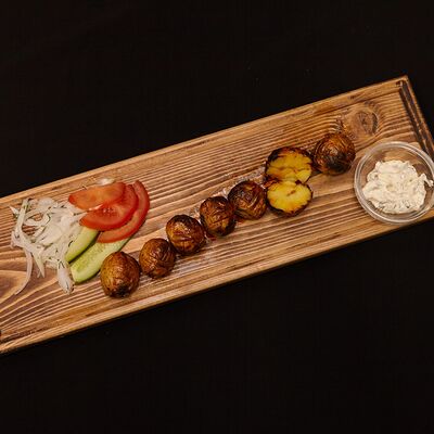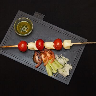 Сыр сулугуни, томаты черри. Подается с соусом песто