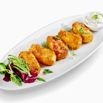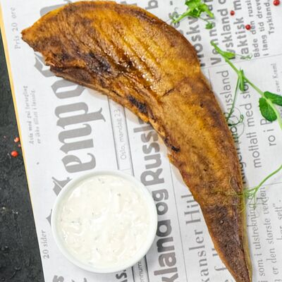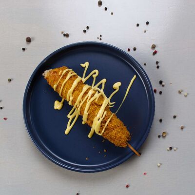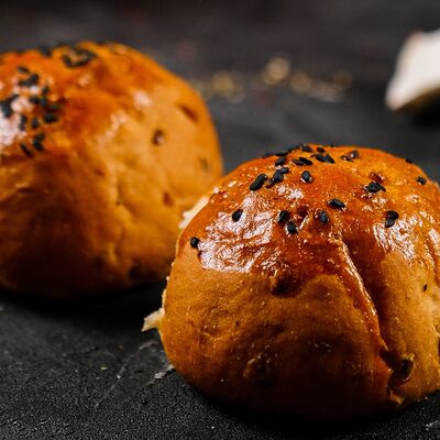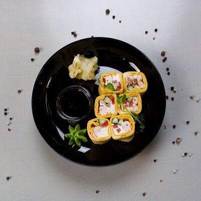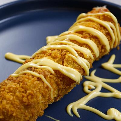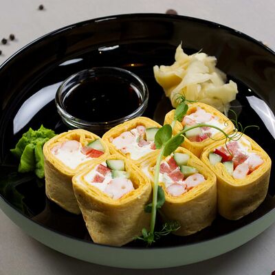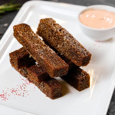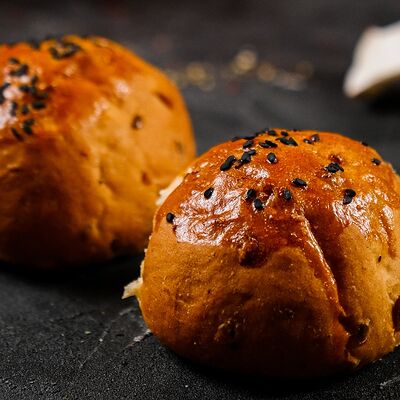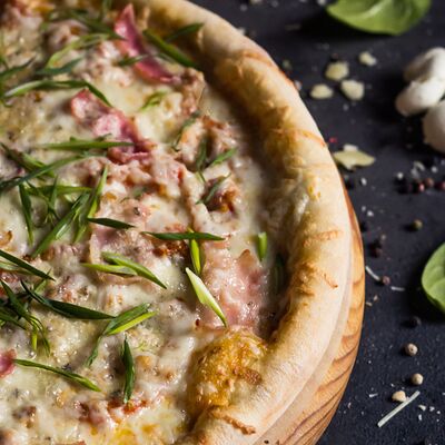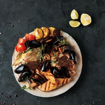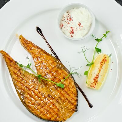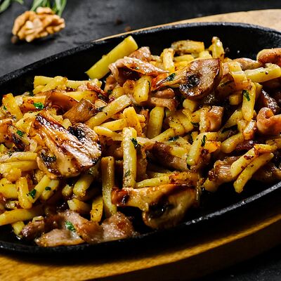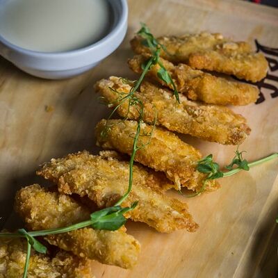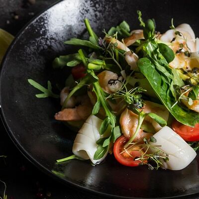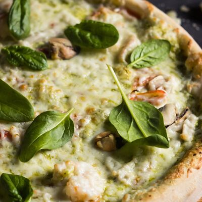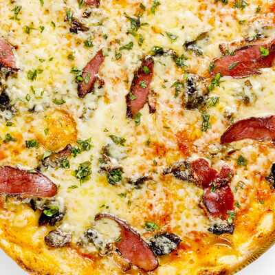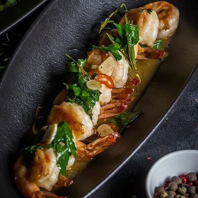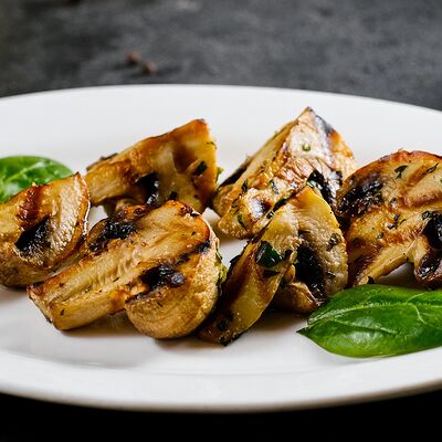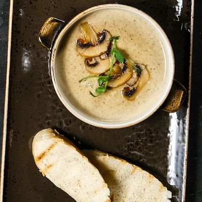 Шампиньоны фаршированные копченной грудинкой и тигровыми креветками. Подаются в сливочном соусе с брускеттой
