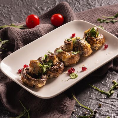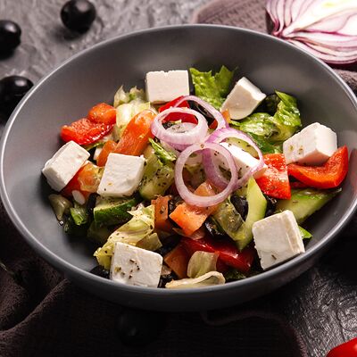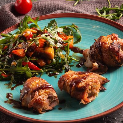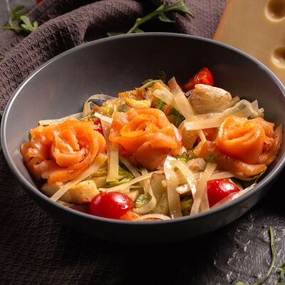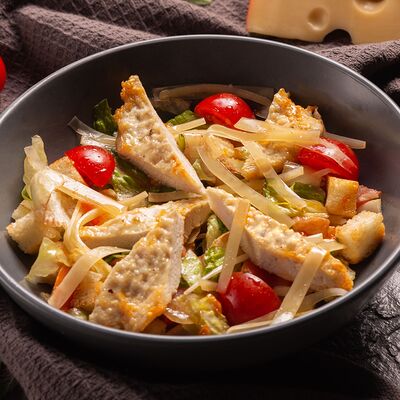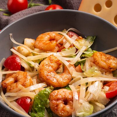 Креветки тигровые, помидоры черри, сыр пармезан, свежие листья салата, сухарики, соус цезарь