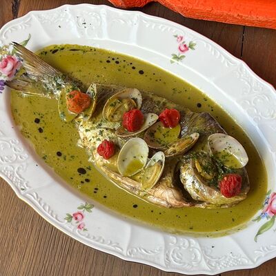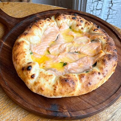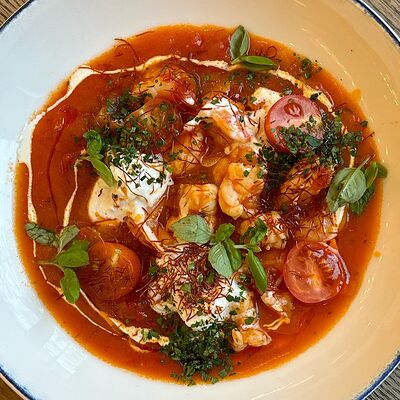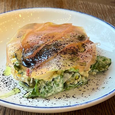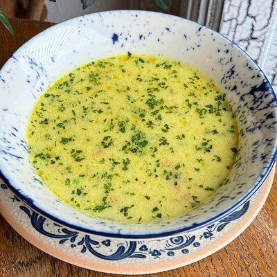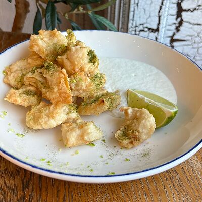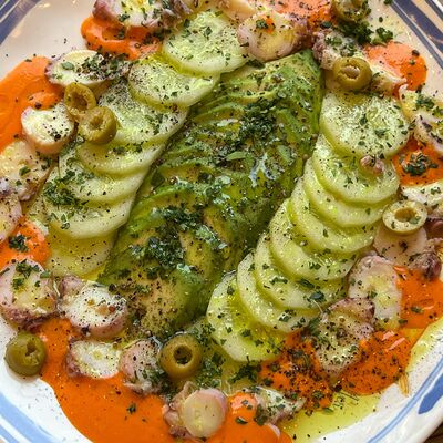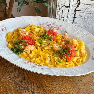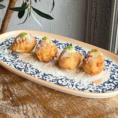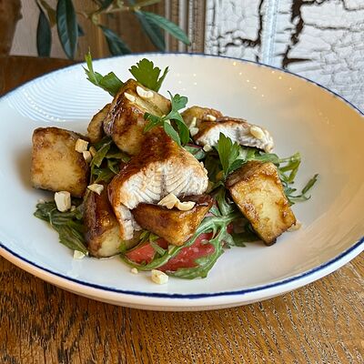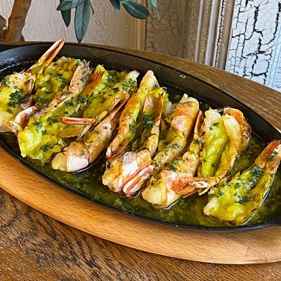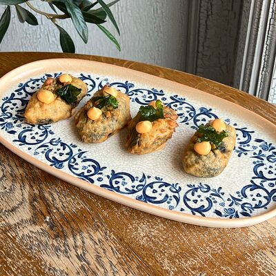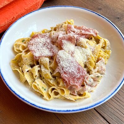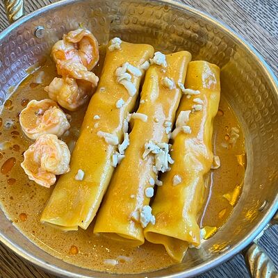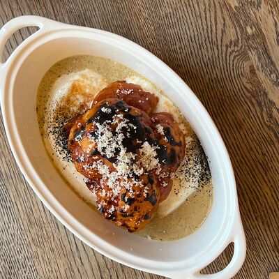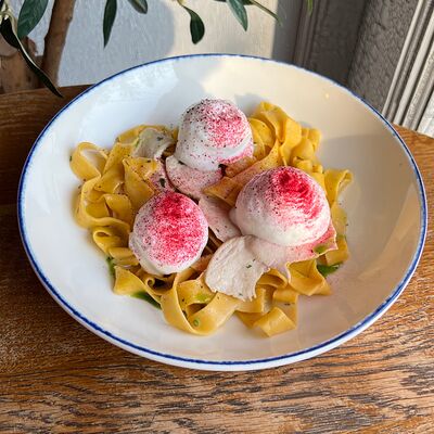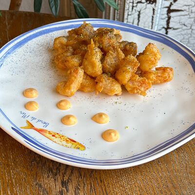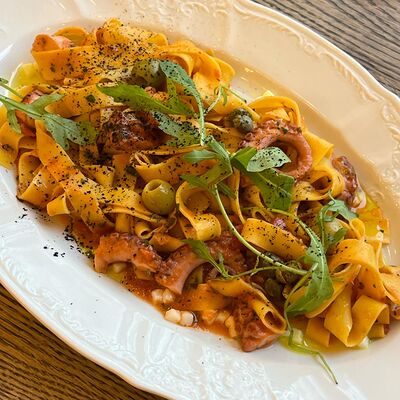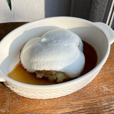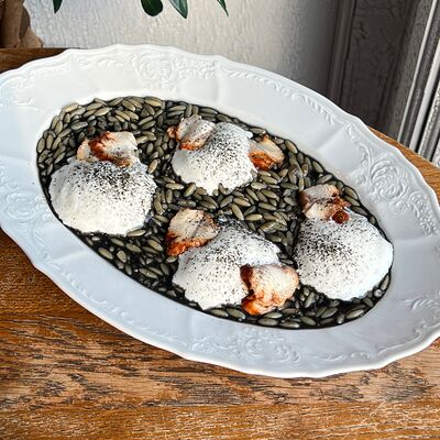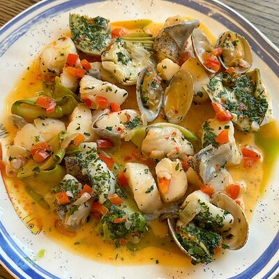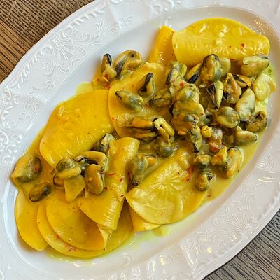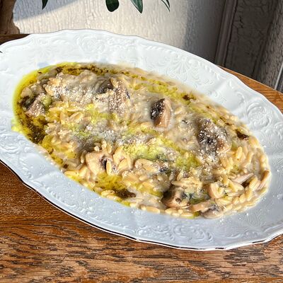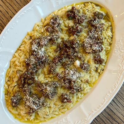 Паста орзо, филе угря, кальмары, мидии, пармезан, сырный мусс, репчатый лук