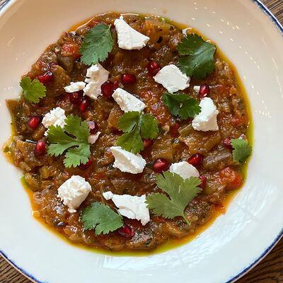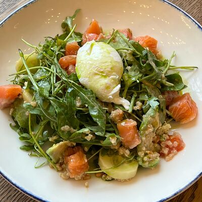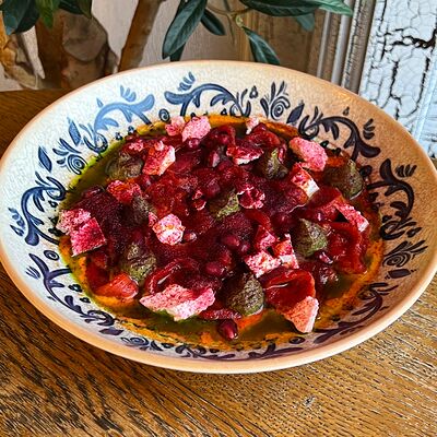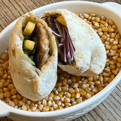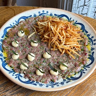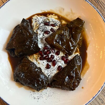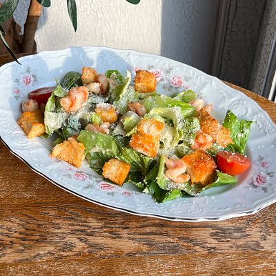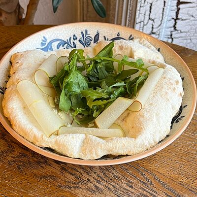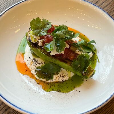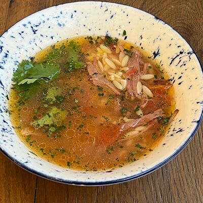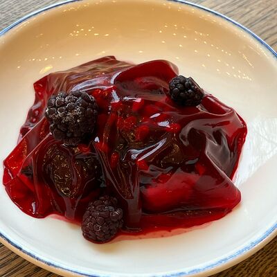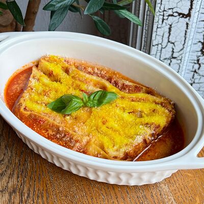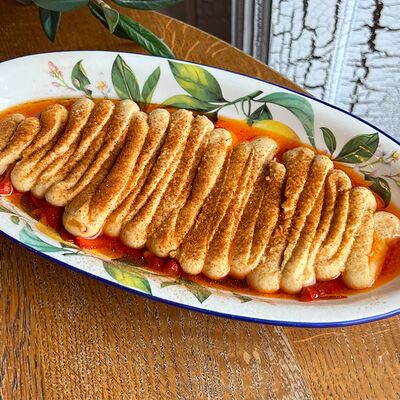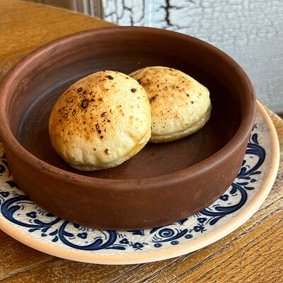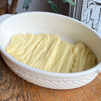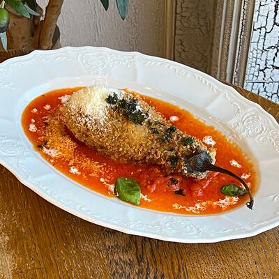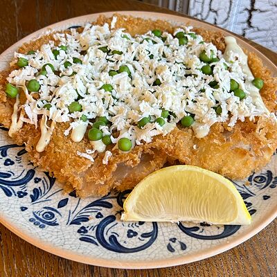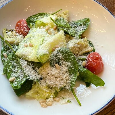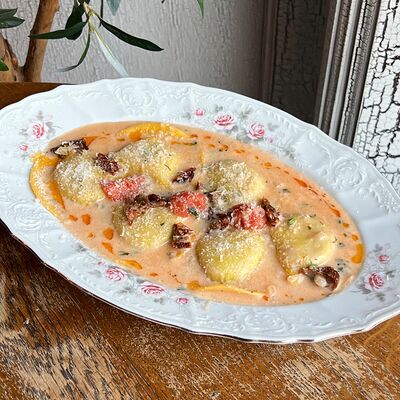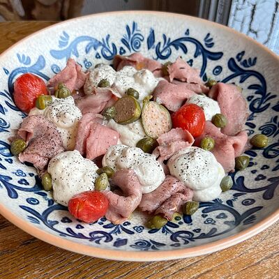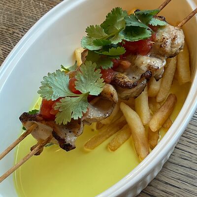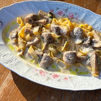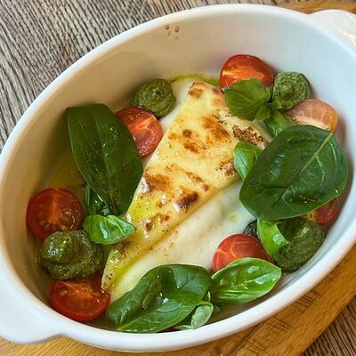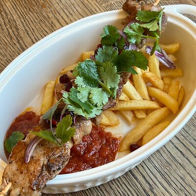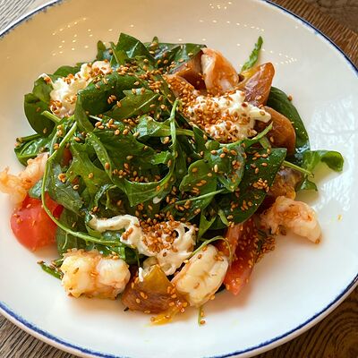 Паста орзо, филе угря, кальмары, мидии, пармезан, сырный мусс, репчатый лук