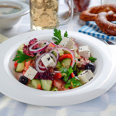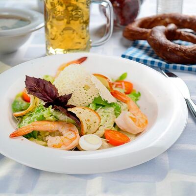 Колбаски нюрнбергские, листья свежего салата, томаты черри вяленые, лук красный, палочка хлебная с маком, яйцо перепелиное, соус цезарь, дрессинг пикантный