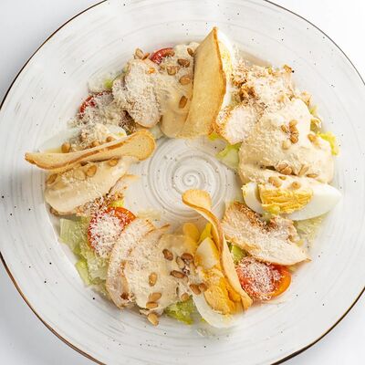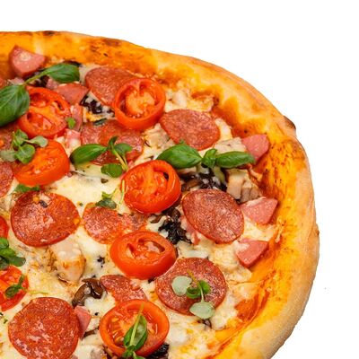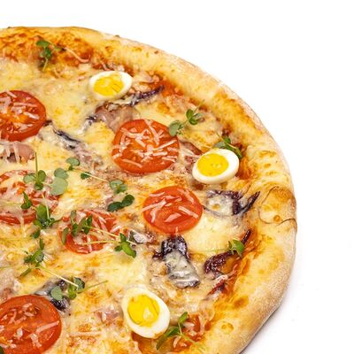 Неаполитанский соус, карамелизованный лук, свиная грудинка, бекон, перепелиное яйцо, помидоры черри, пармезан, моцарелла (30 см)
