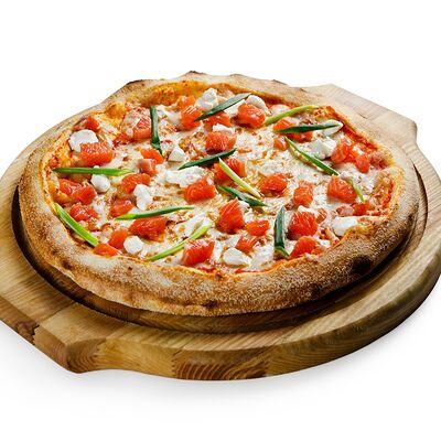 Филе лосося слабой соли с сыром моцарелла, фирменным томатным соусом с добавлением творожного сыра, зеленого лука и итальянских специй (30 см)