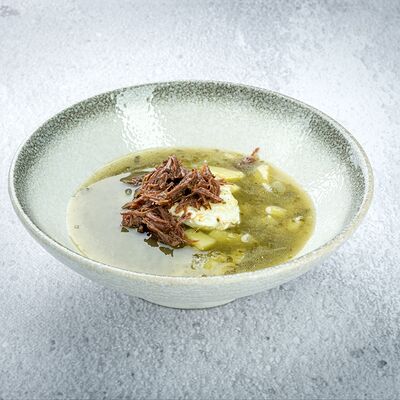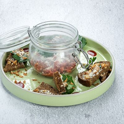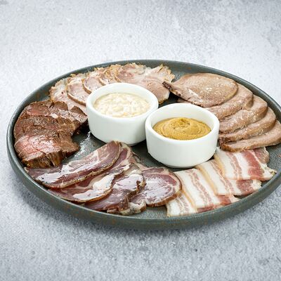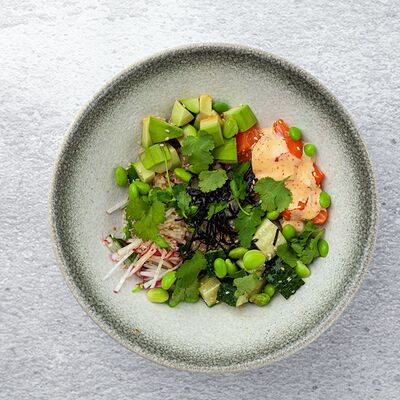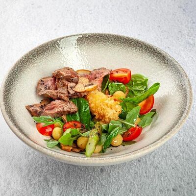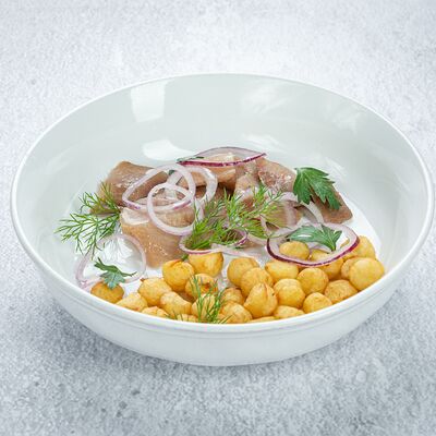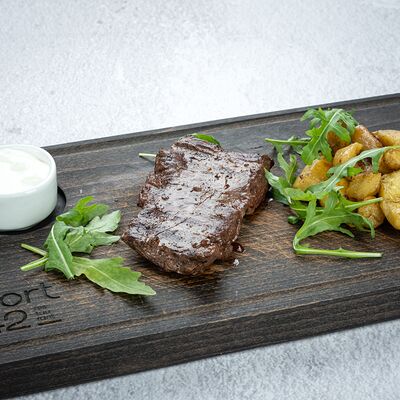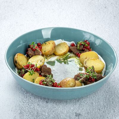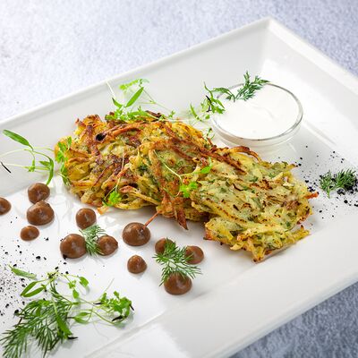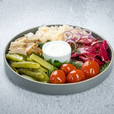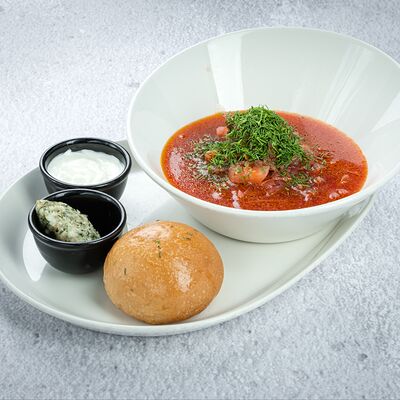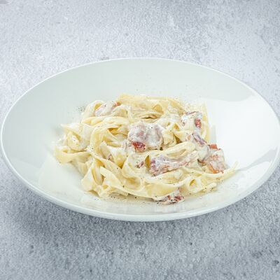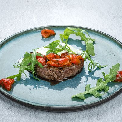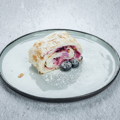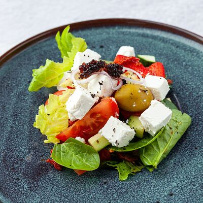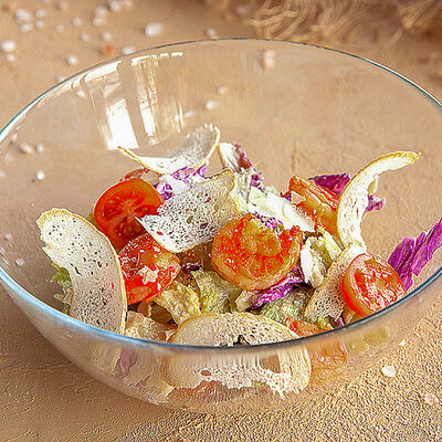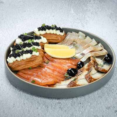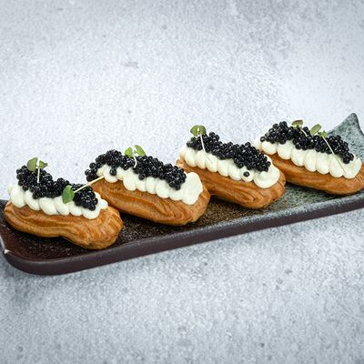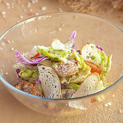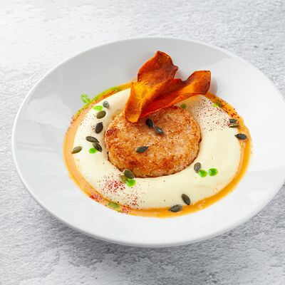 Фаланга краба, соус сметанковый, икра осетровая имитированная, cливки, салат руккола, морковь, масло трюфельное