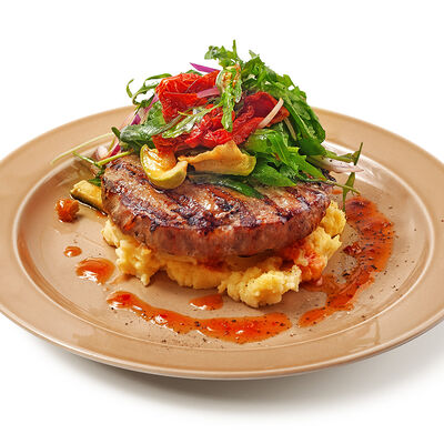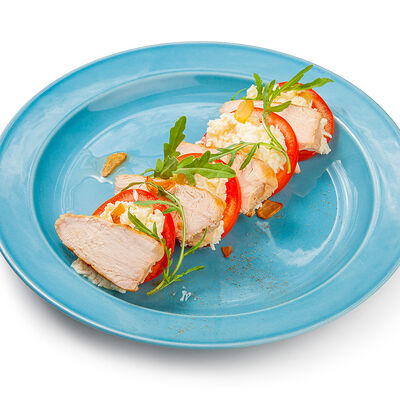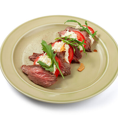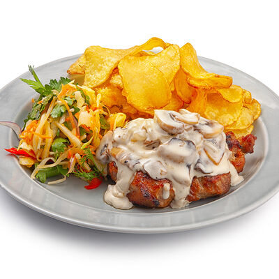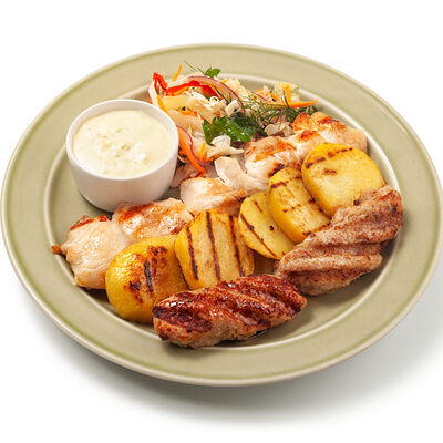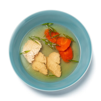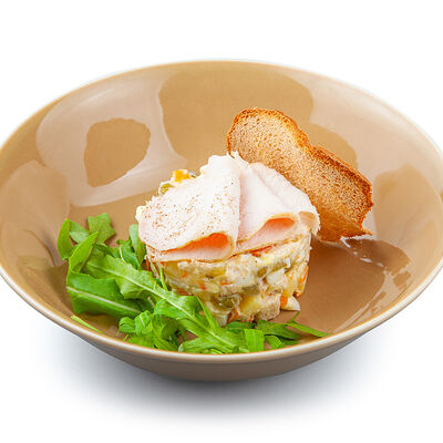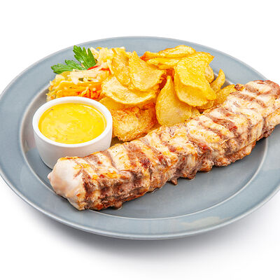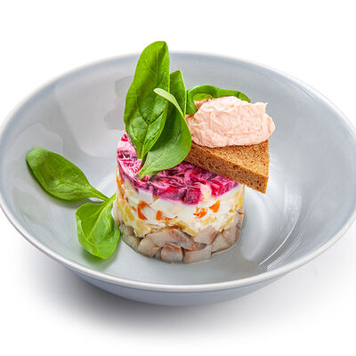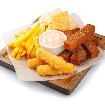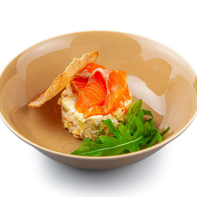 Насыщенный сливочным вкусом овощной суп с рыбой Овощной суп (бульон, картофель, лук репчатый, масло сливочное, приправа для рыбы), рыба (семга филе, масляная рыба), сливки, батон, соус икорный (икра минтая, майонез, сметана), зелень петрушки