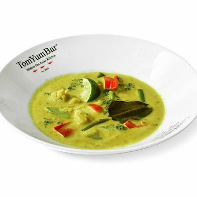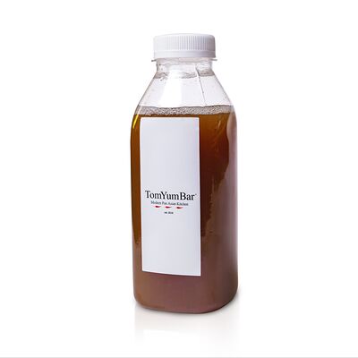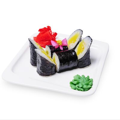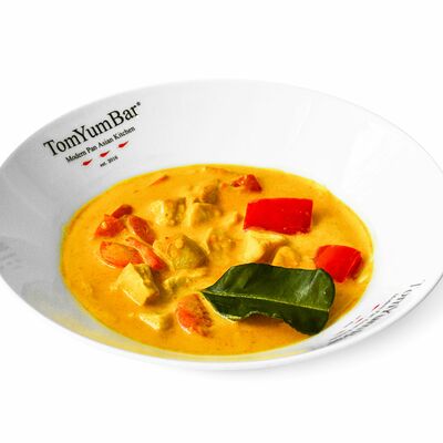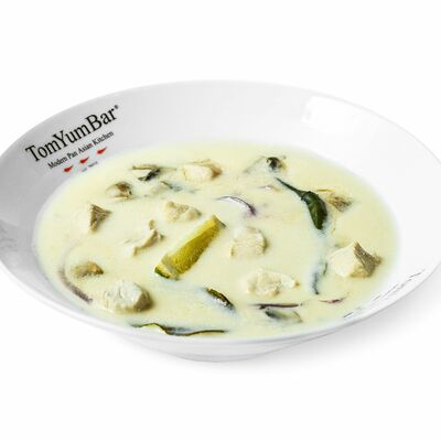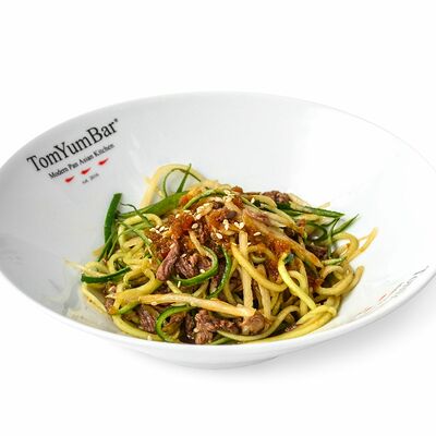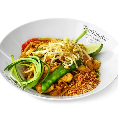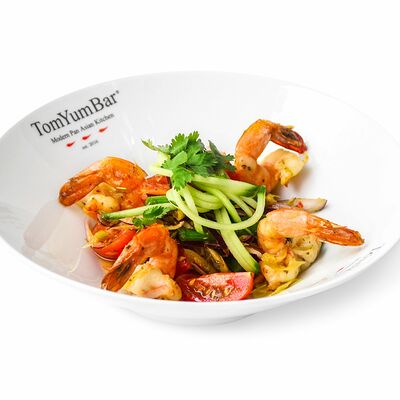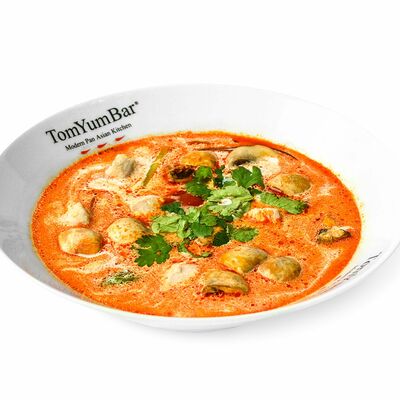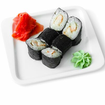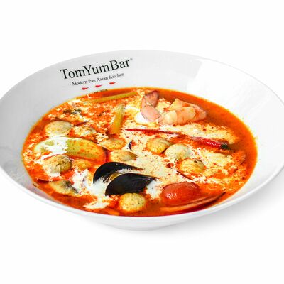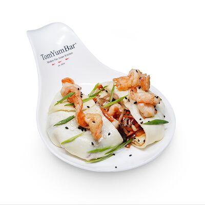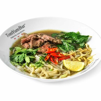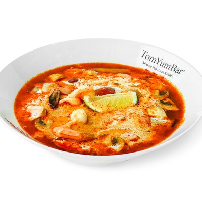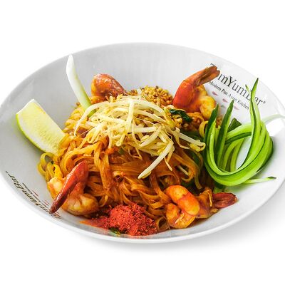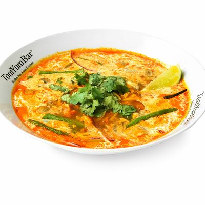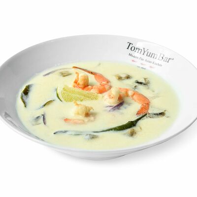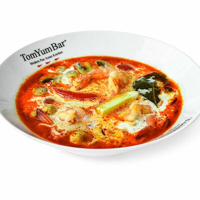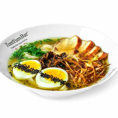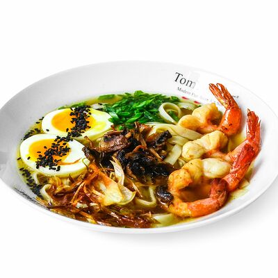 Суп на основе куриного бульона с лапшой рамен, зеленым луком, луком-порей, шампиньонами, яйцом всмятку и королевскими креветками