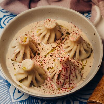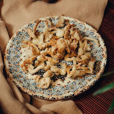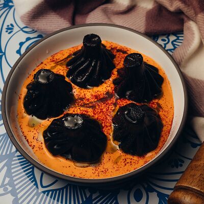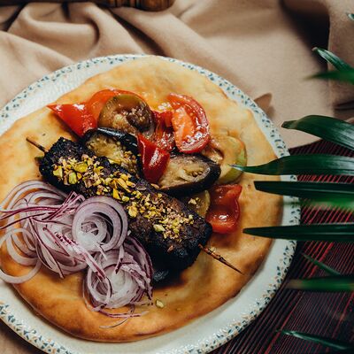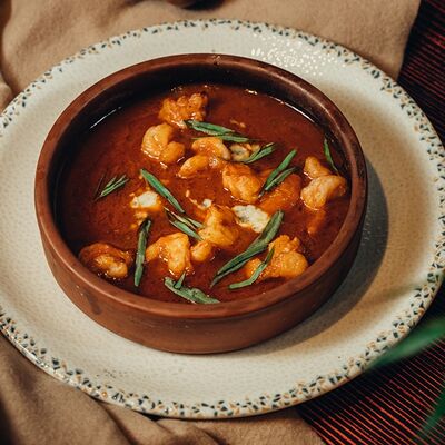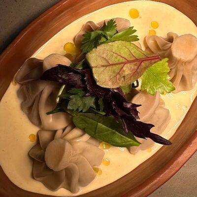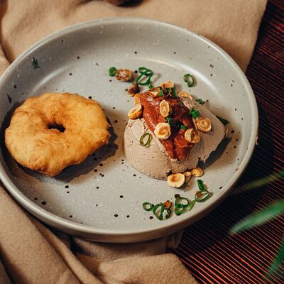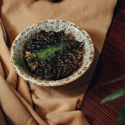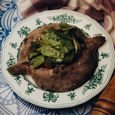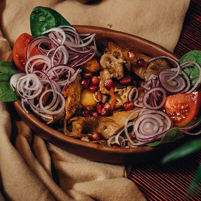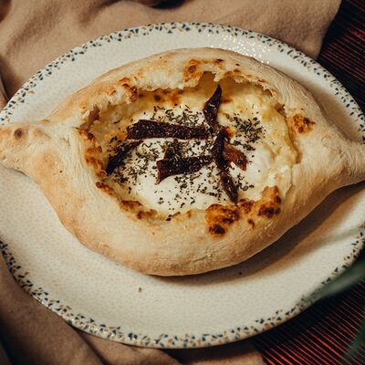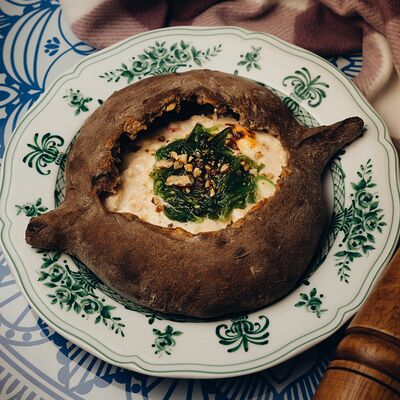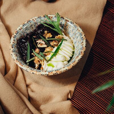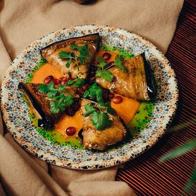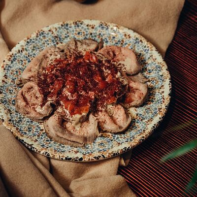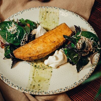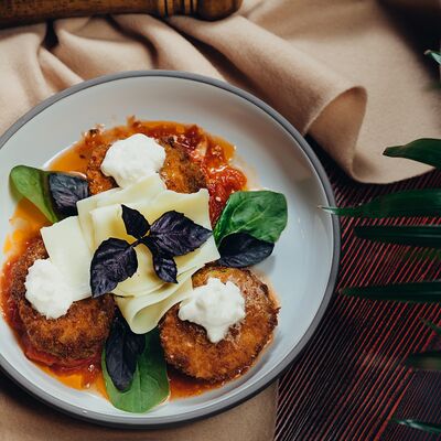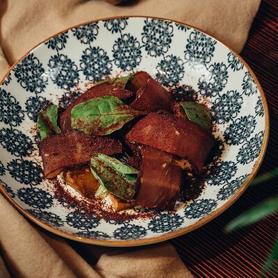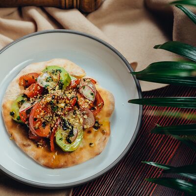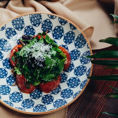 Томленые томаты с хрустящими цукини. Украшается страчателлой, сыром сулугуни, листьями шпината и базилика