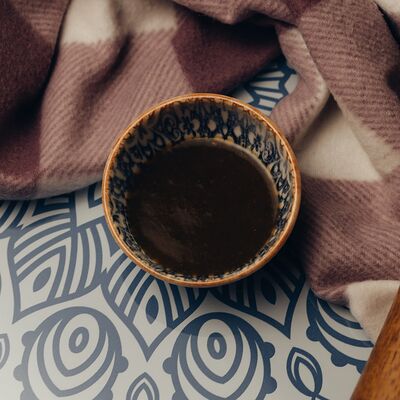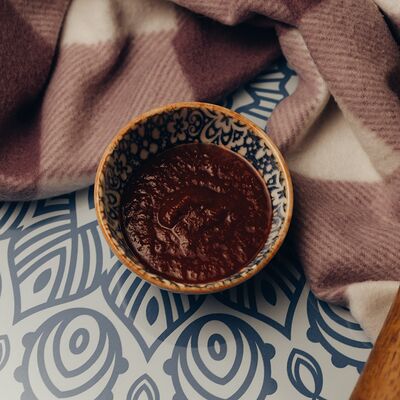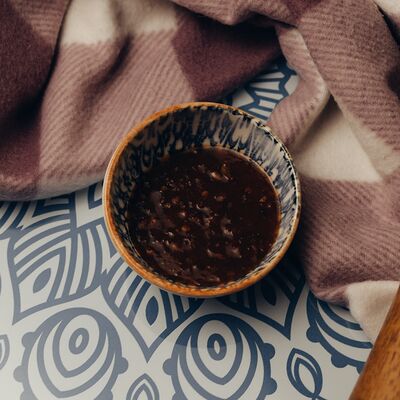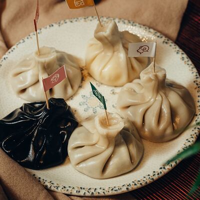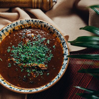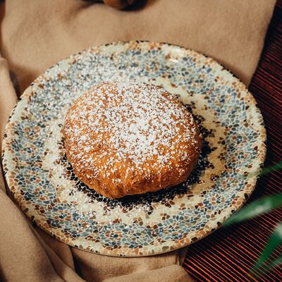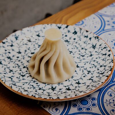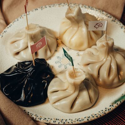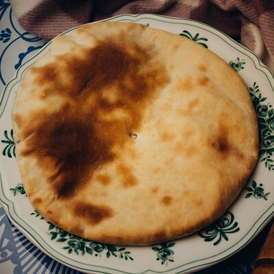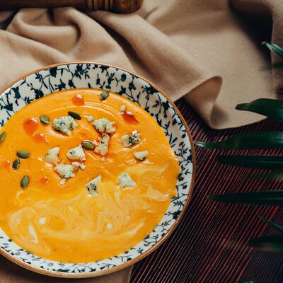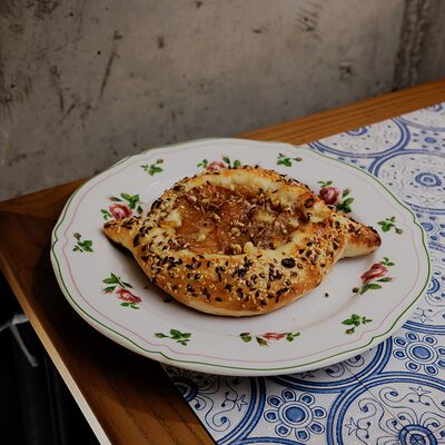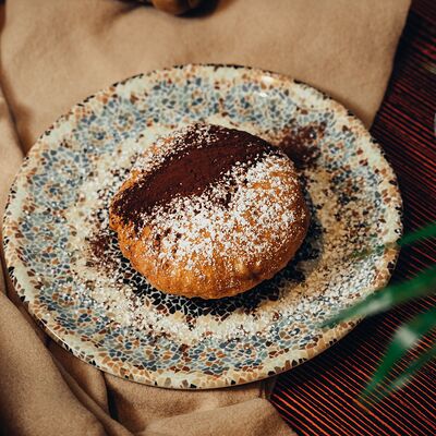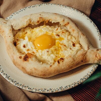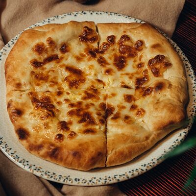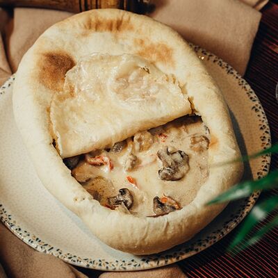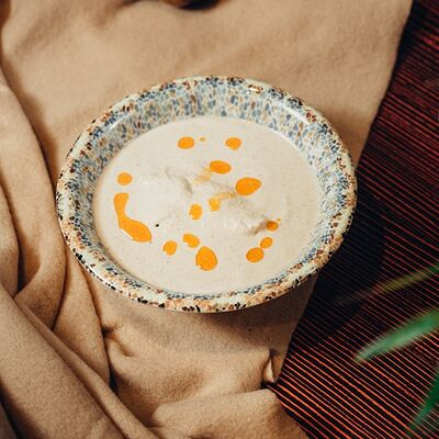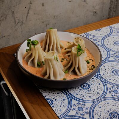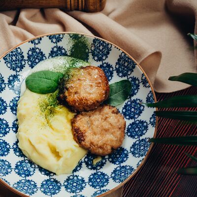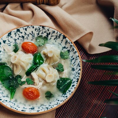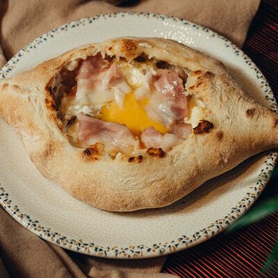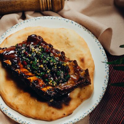 Томленые томаты с хрустящими цукини. Украшается страчателлой, сыром сулугуни, листьями шпината и базилика