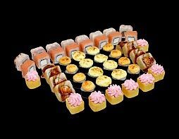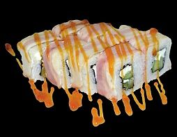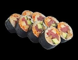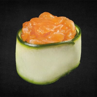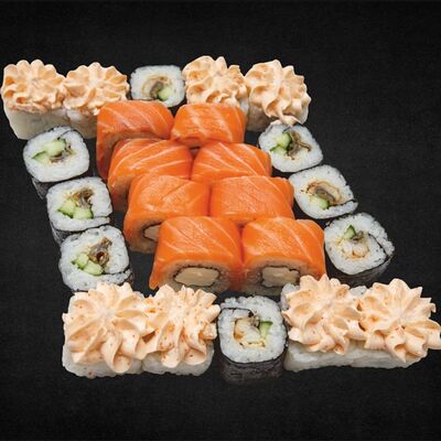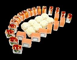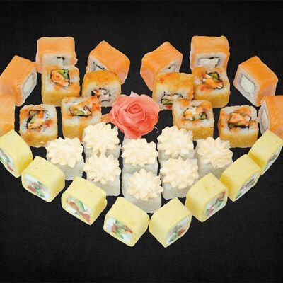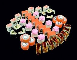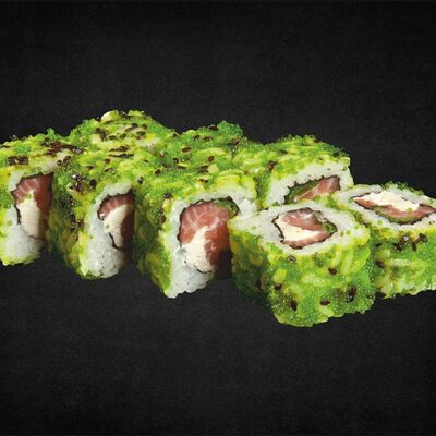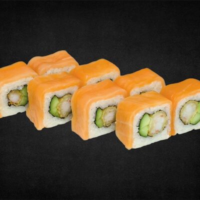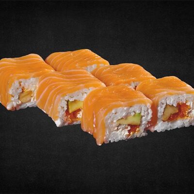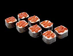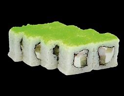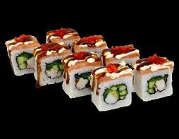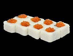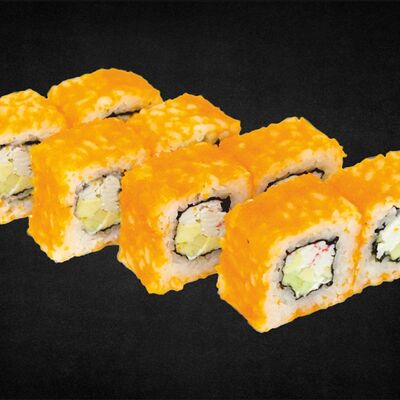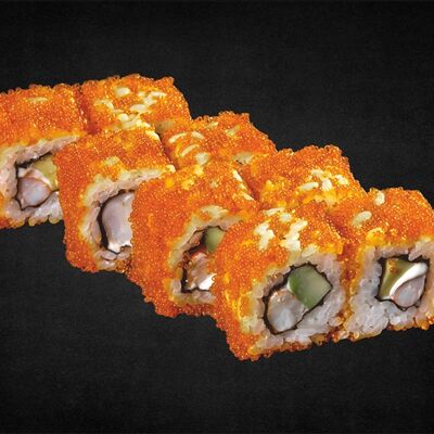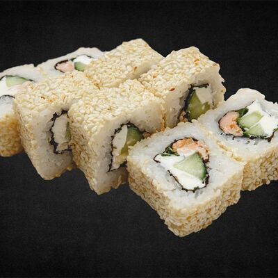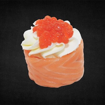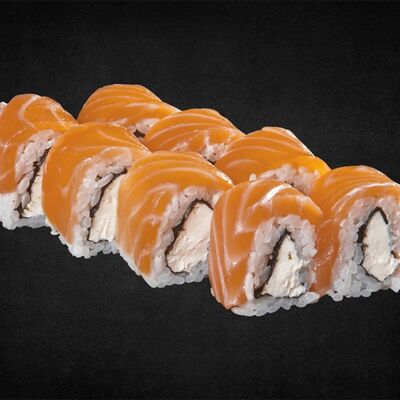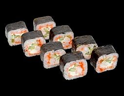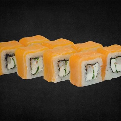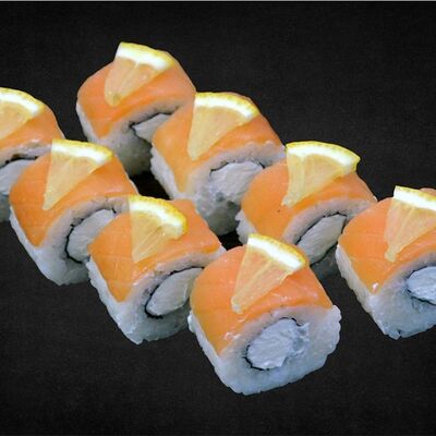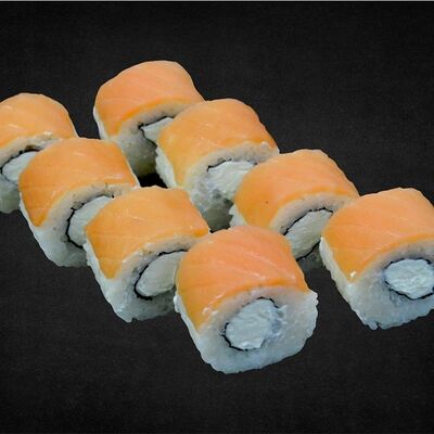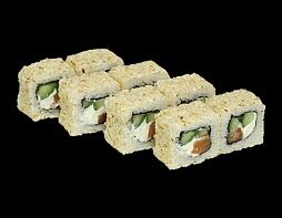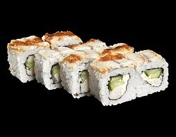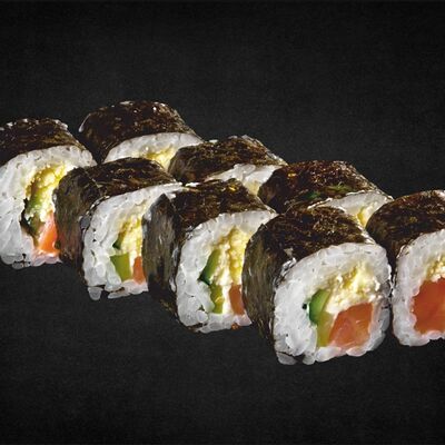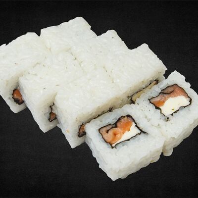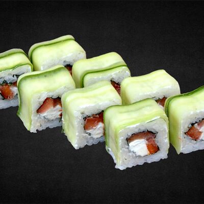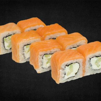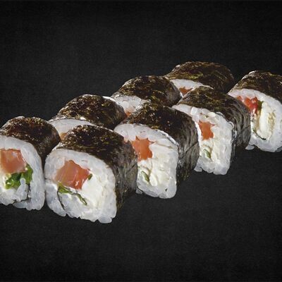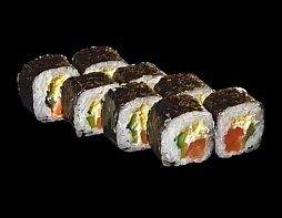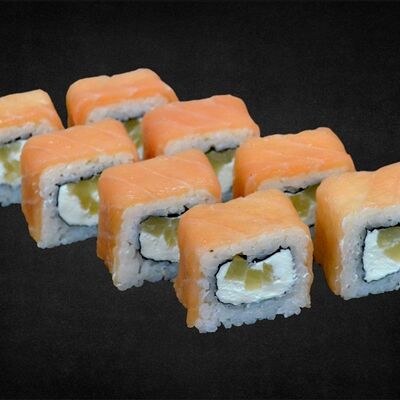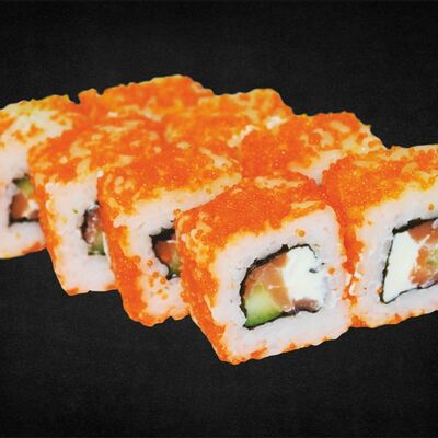 Филе лосося малосоленого, огурец свежий, сливочный сыр, массага оранжевая Соевый соус, имбирь, васаби в комплект не входят