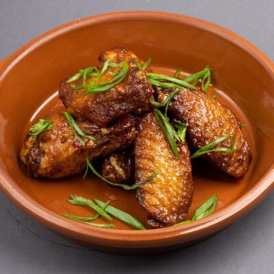 Крылья, соус сладкий чили, смесь соусов, лук зеленый