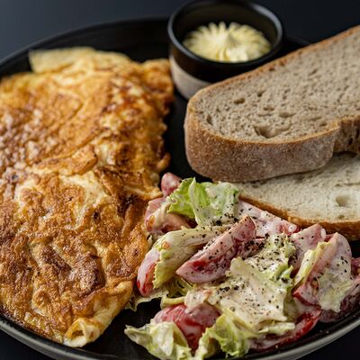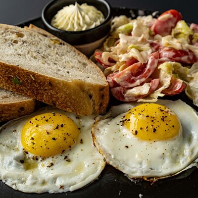 Яйца, помидоры черри, листья салата. Подается с ремесленным хлебом и сливочным маслом