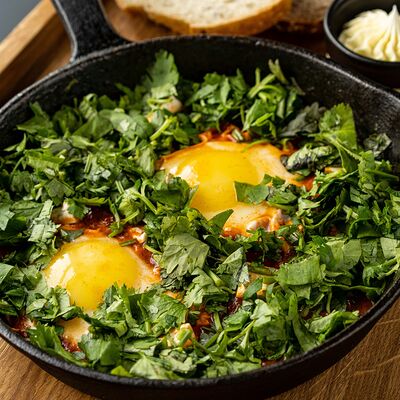 Глазунья из двух яиц с помидорами и зеленью доставка