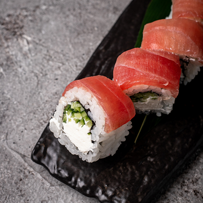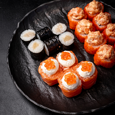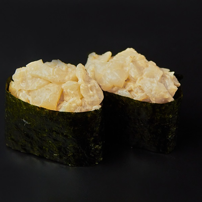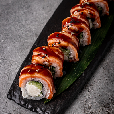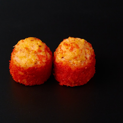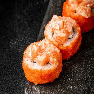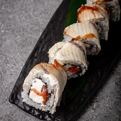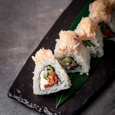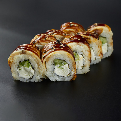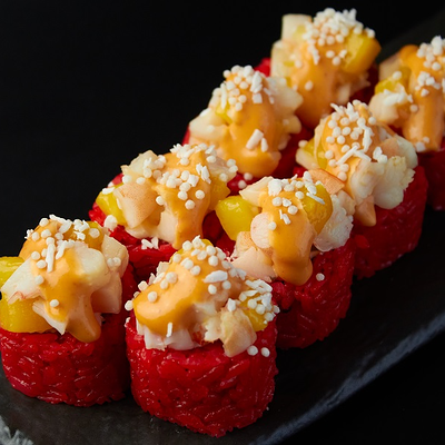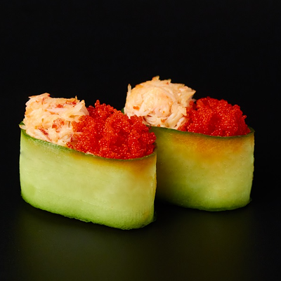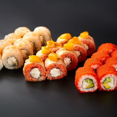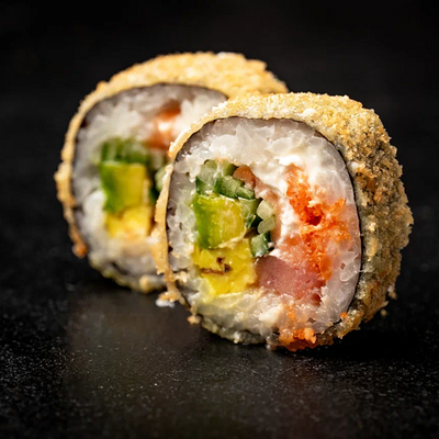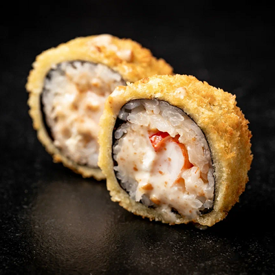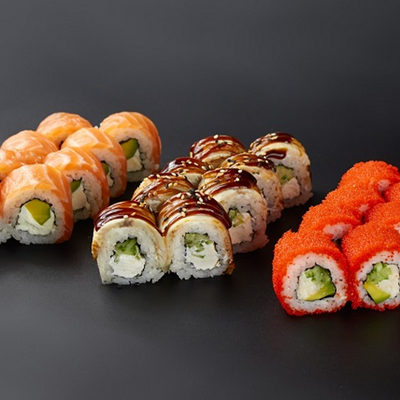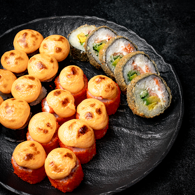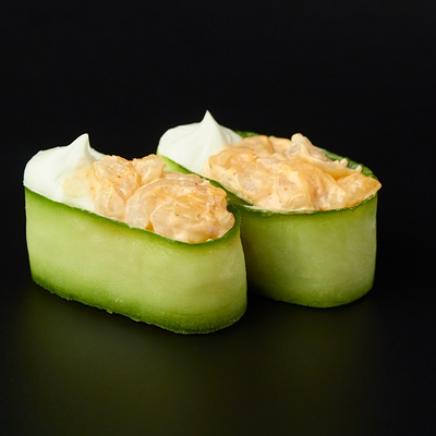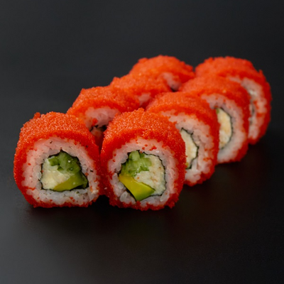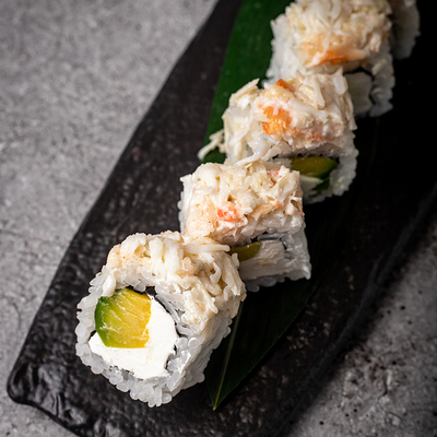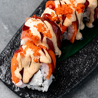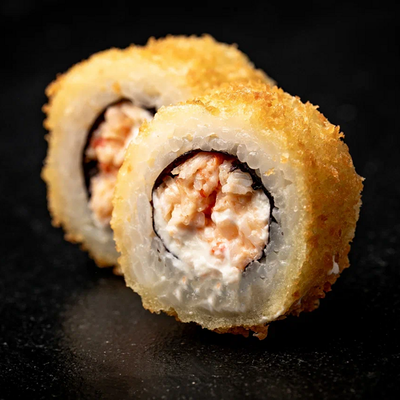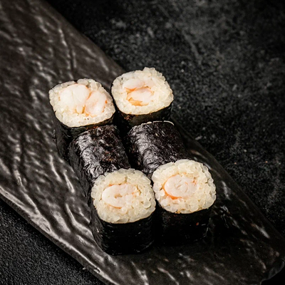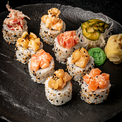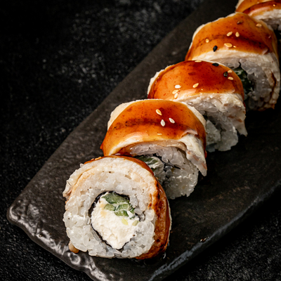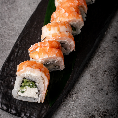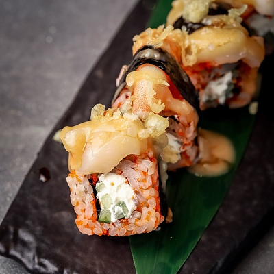 Креветка тигровая, гребешок, икра масаго, сыр творожный сыр, огурец, соус понзу, соус поке, хрустящая темпура, рис японский (8 шт.)