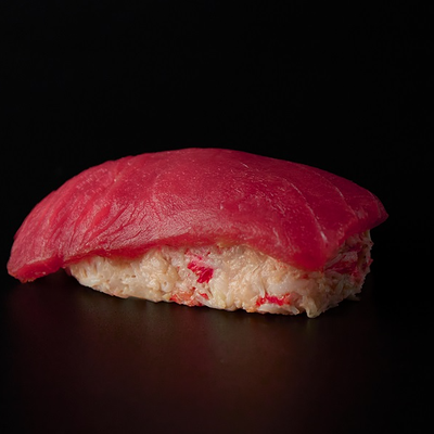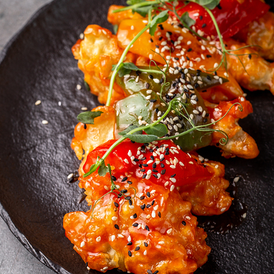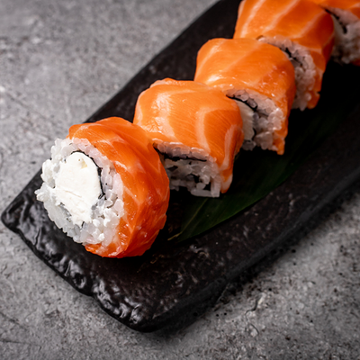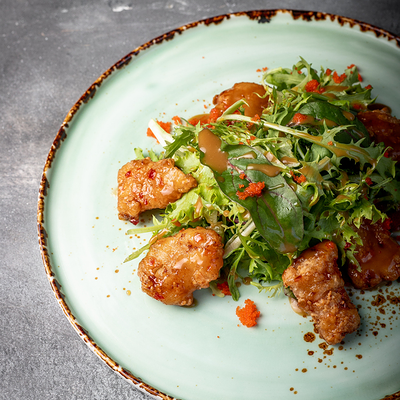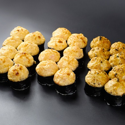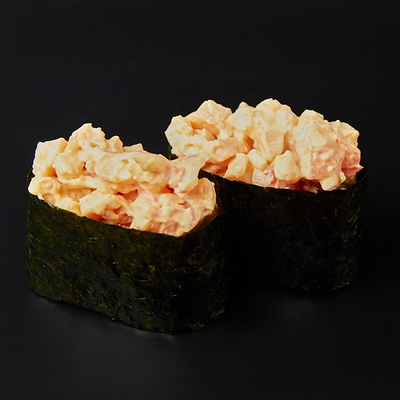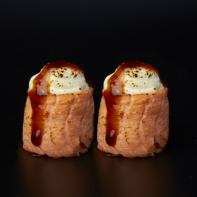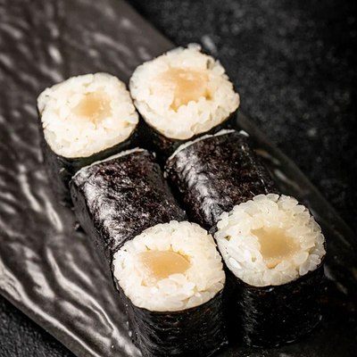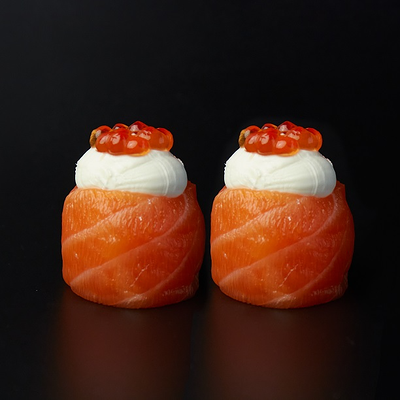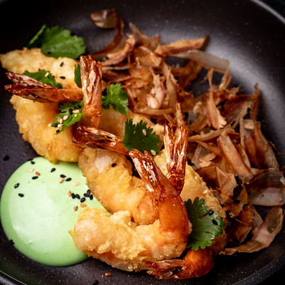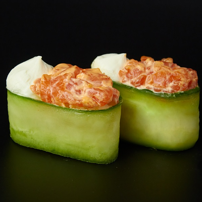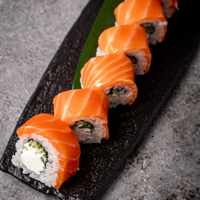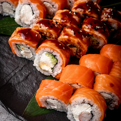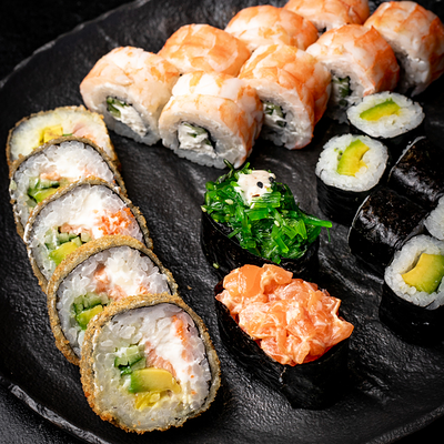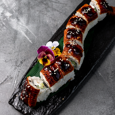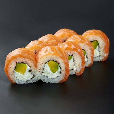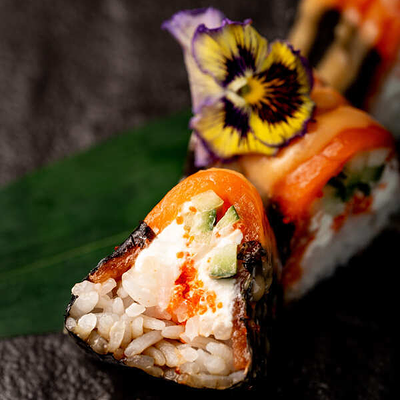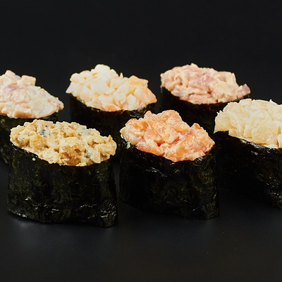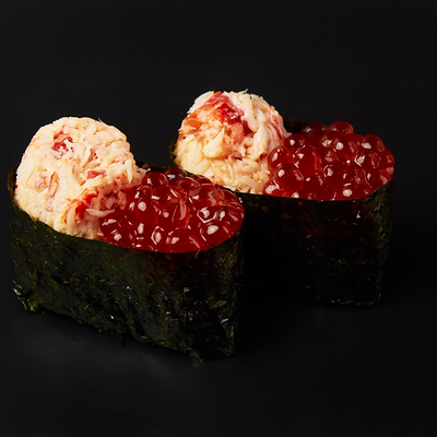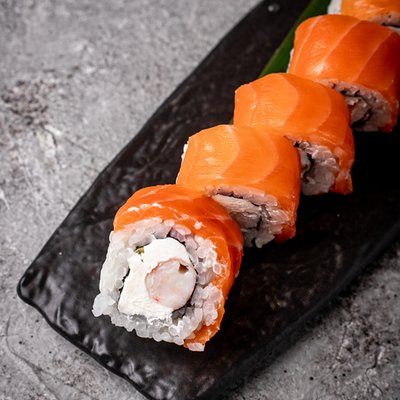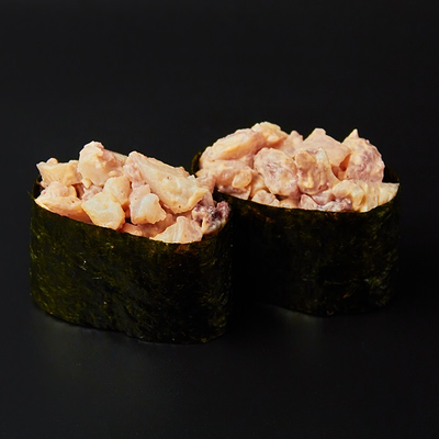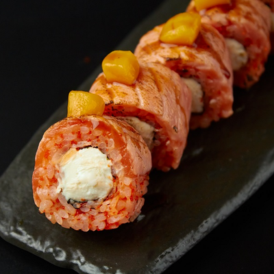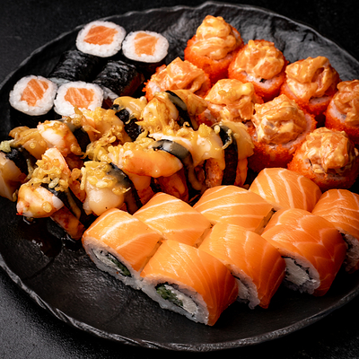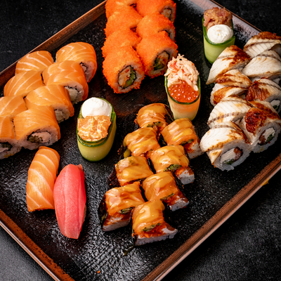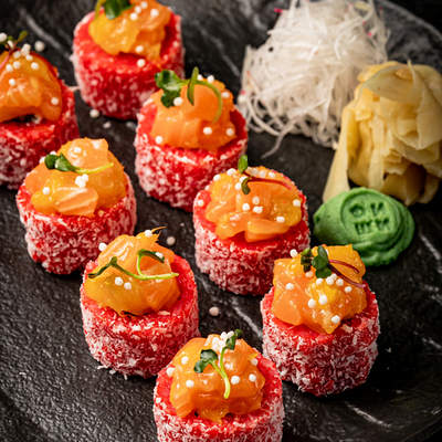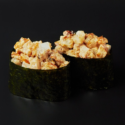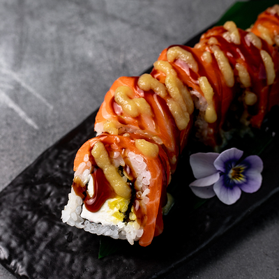 Креветка тигровая, гребешок, икра масаго, сыр творожный сыр, огурец, соус понзу, соус поке, хрустящая темпура, рис японский (8 шт.)