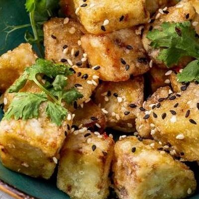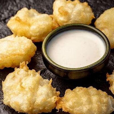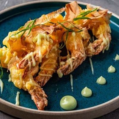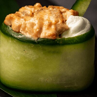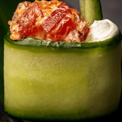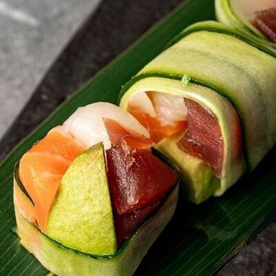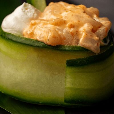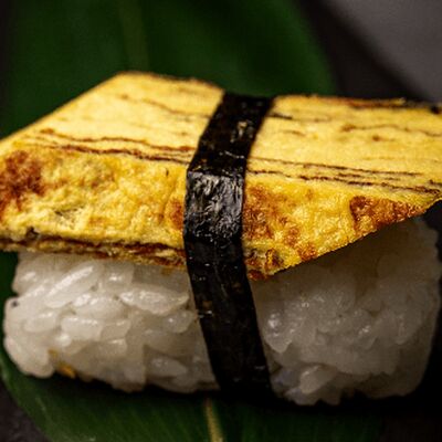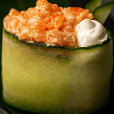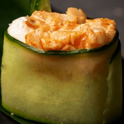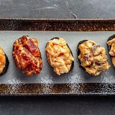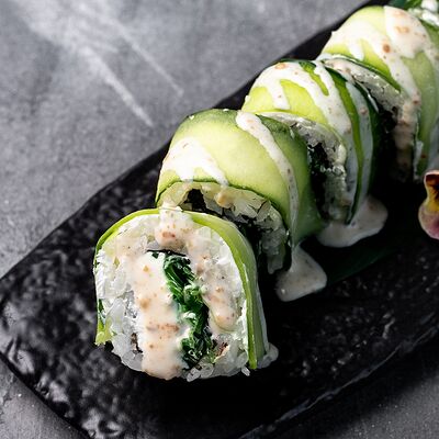 Мидия, огурец, омлет тамаго, сыр пармезан, соус запеченный