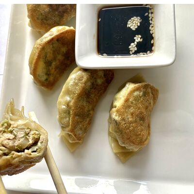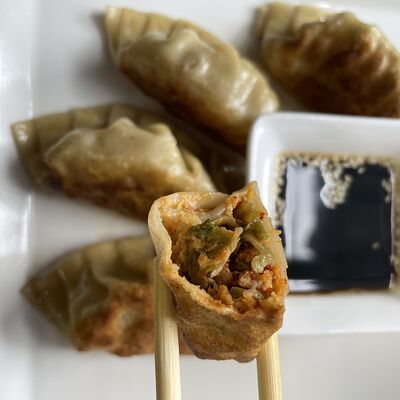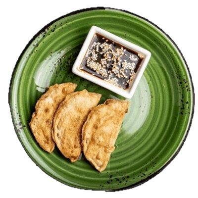 Японские жареные пельмени с начинкой из пекинской капусты и куриного фарша. Подаются с особым соусом (3 шт.)
