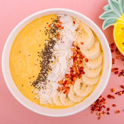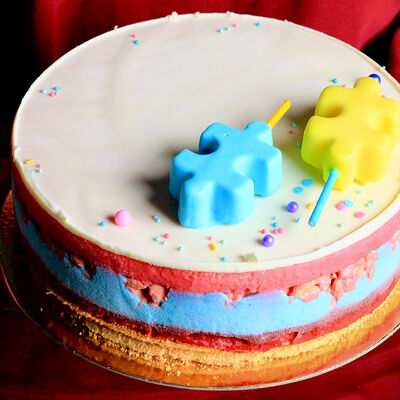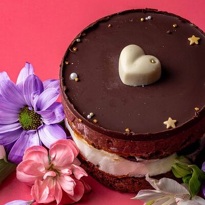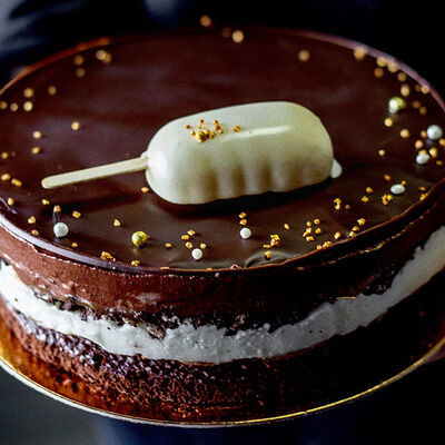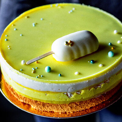 Йогуртовое мороженое кокос и ананас, прослойка манго и ананас, кокосовая меренга, кокосовый бисквит, шоколадная глазурь, шоколадная фигурка