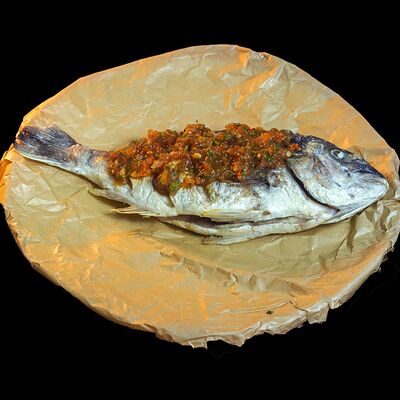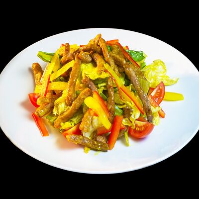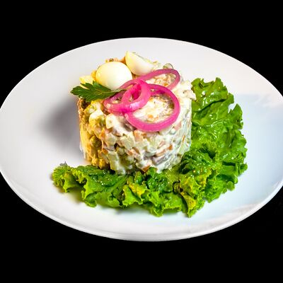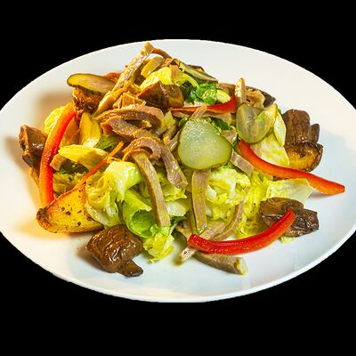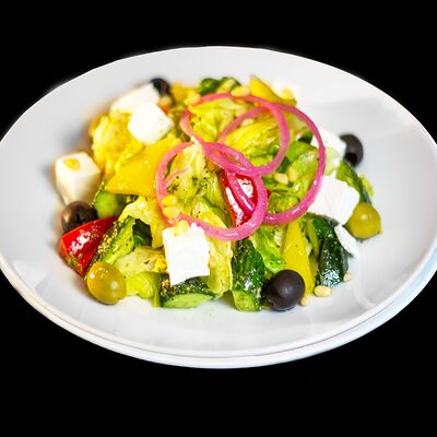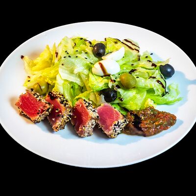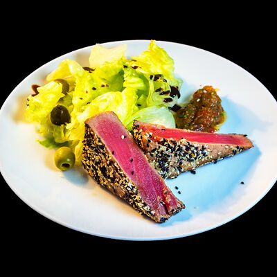 Микс салата, тунец, обжаренный в кунжуте, оливковое масло, маслины, оливки, крем бальзамик, соус сальса