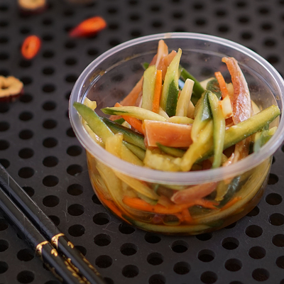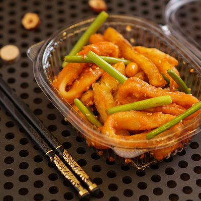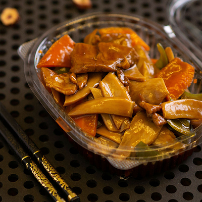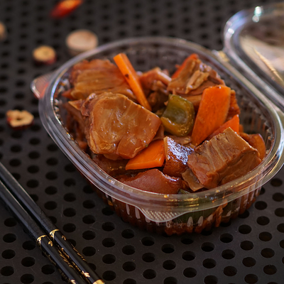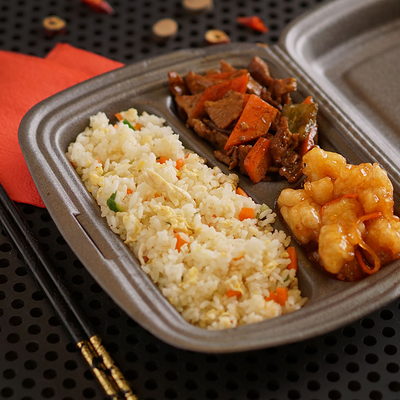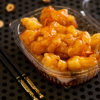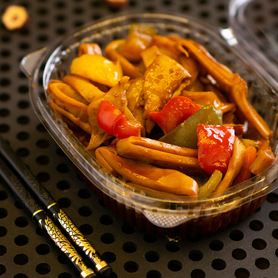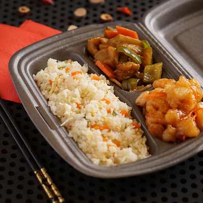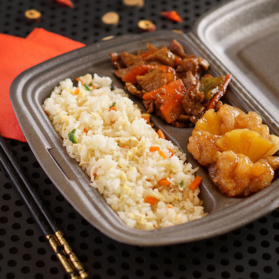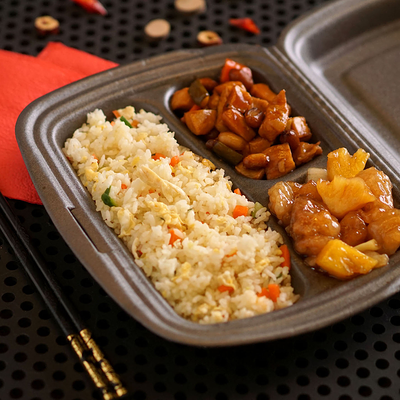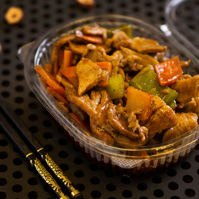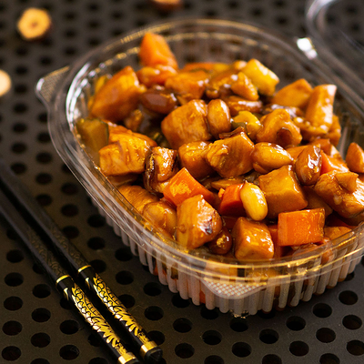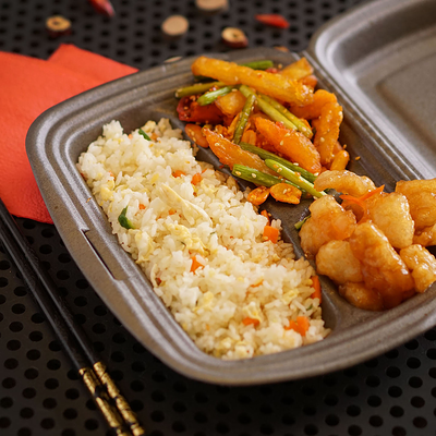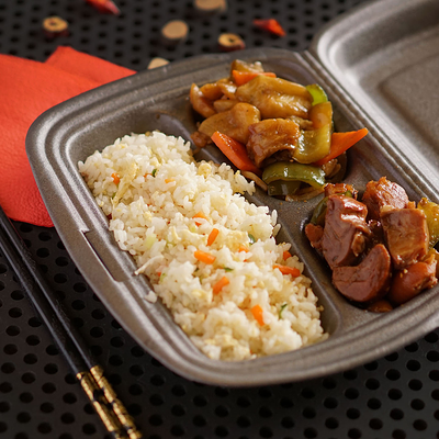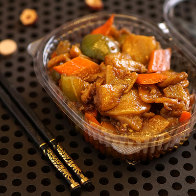 Пшеничная лапша, курица в кисло-сладком соусе, картофель с баклажанами