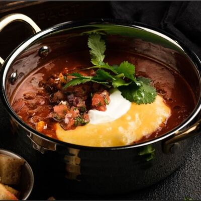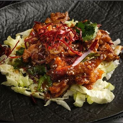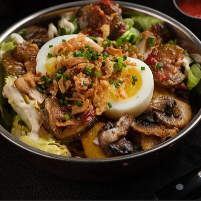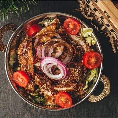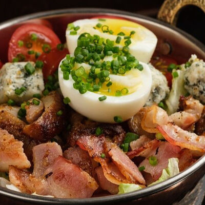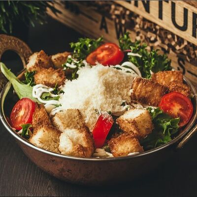 Салат романо, классический соус цезарь, помидоры черри, сыр пармезан, чесночные сухарики и хрустящая индейка