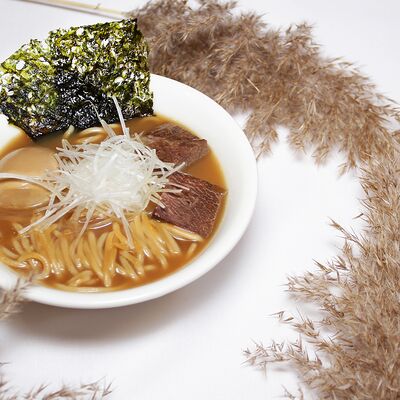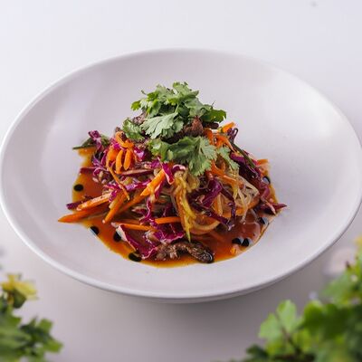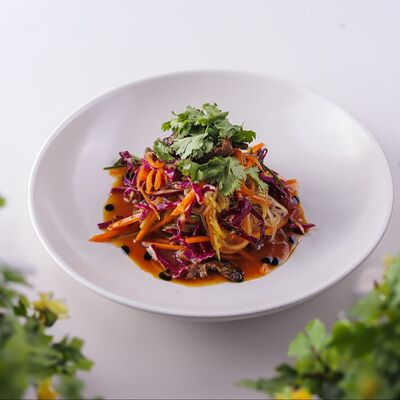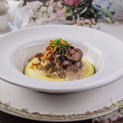 Говядина, лук, грибы шиитаке маринованные, огурцы маринованные, лук фри, картофельное пюре (картофель, молоко)