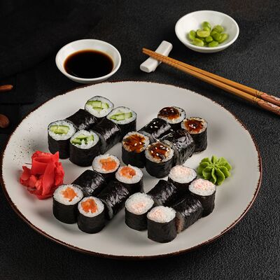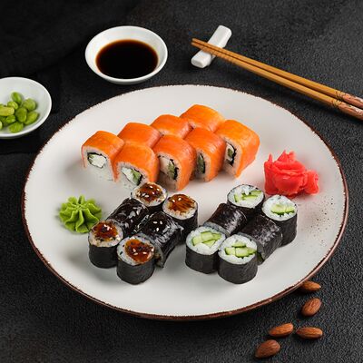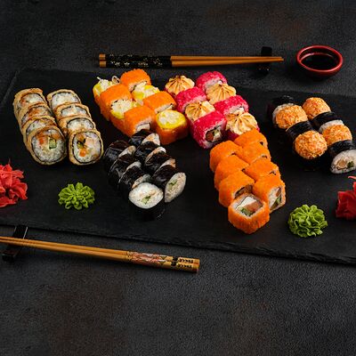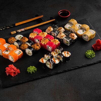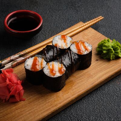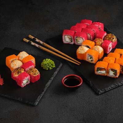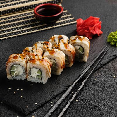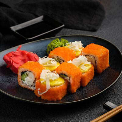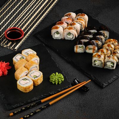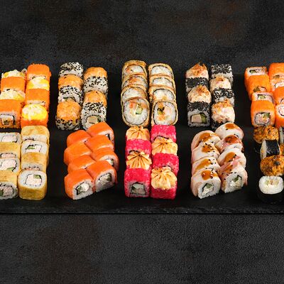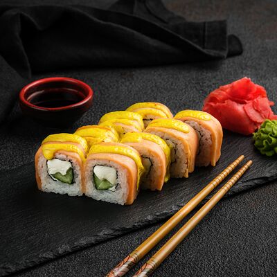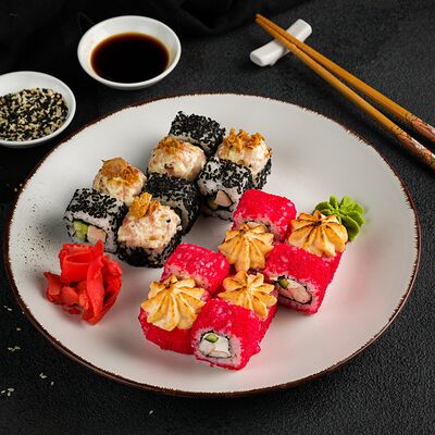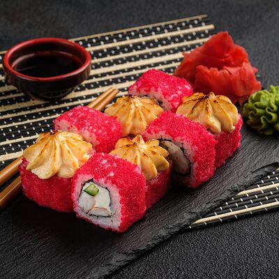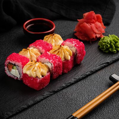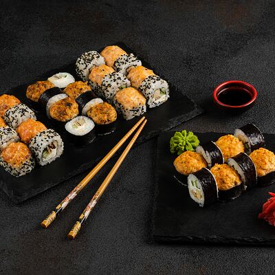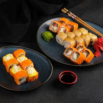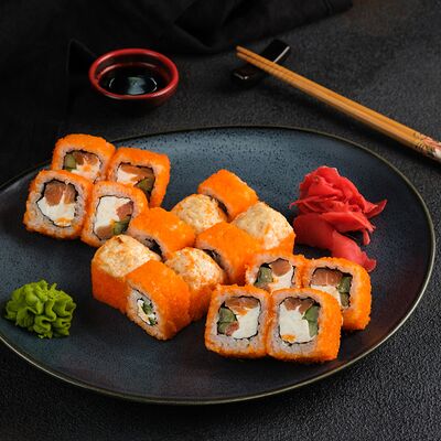 Филадельфия в икре, Эби яки, Тори яки, запеченный Сырный с мидией