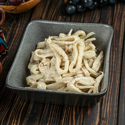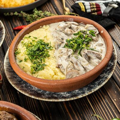 Куриная печень, шампиньоны, лук, сливочный соус