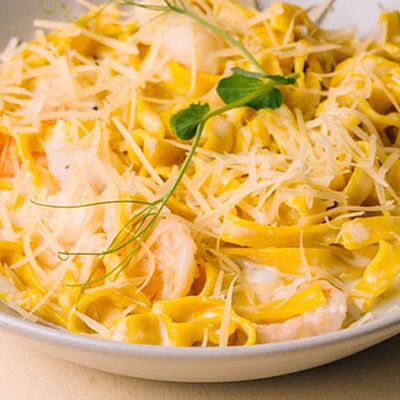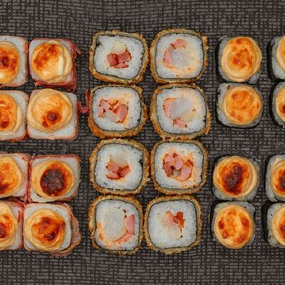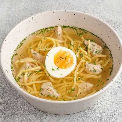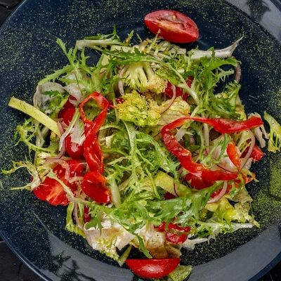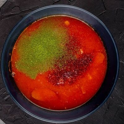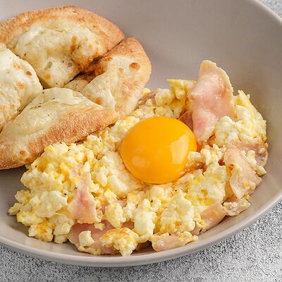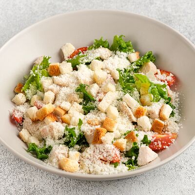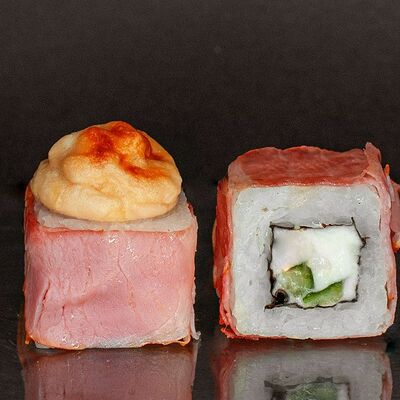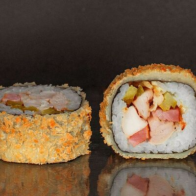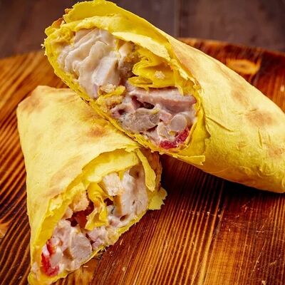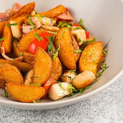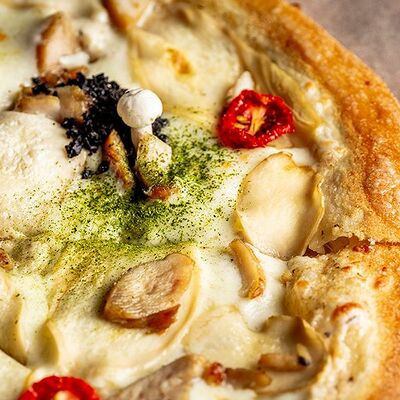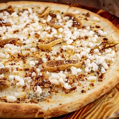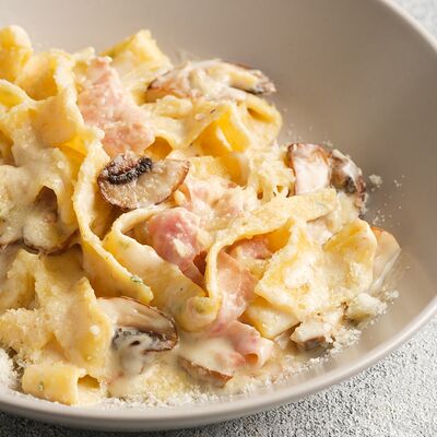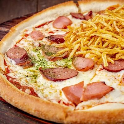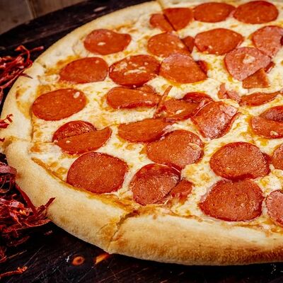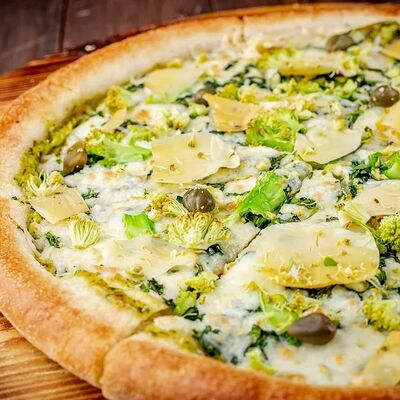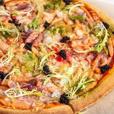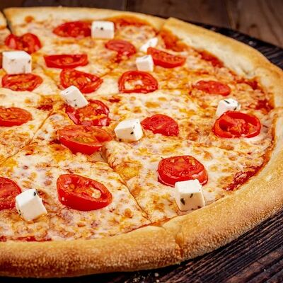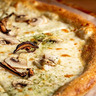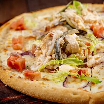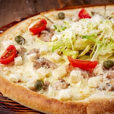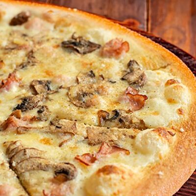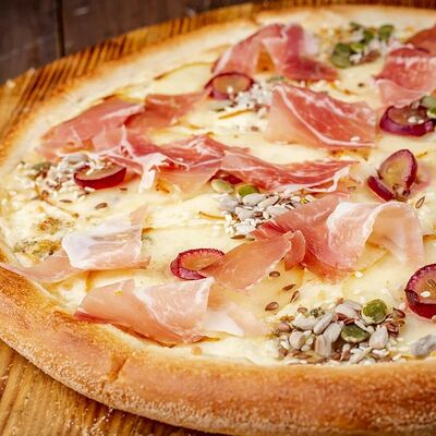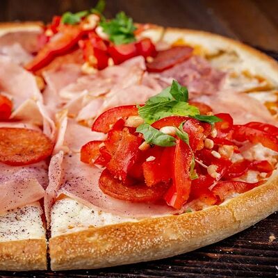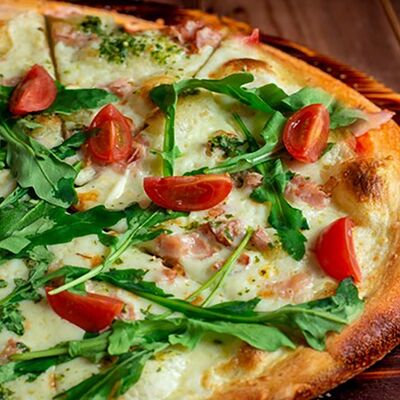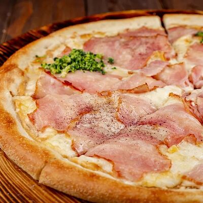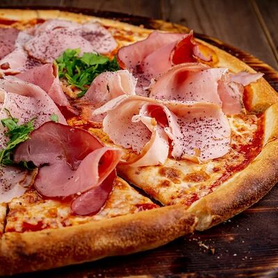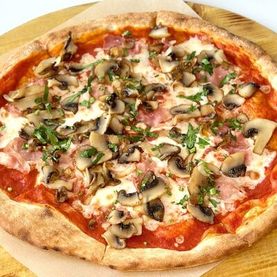 Тонкое тесто, томатный соус, моцарелла, окорок cвинoй, шампиньоны, петрушка (31 см)