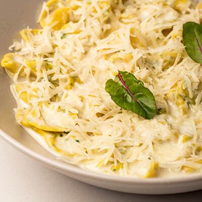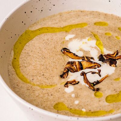 Шампиньоны, лук, грибной бульон, сливочный соус, зелёное масло, чипсы из шиитаке. Кбжу: 428,81/8,32/40,51/7,78