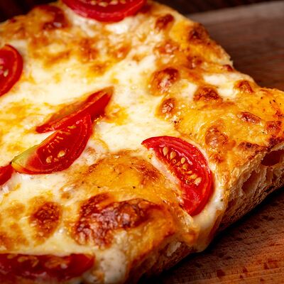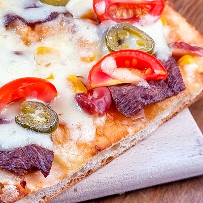 Тесто, соус барбекю, говядина маринованная, кукуруза, фасоль, помидоры черри, сыр моцарелла, перец острый халапеньо (30х30 см)
